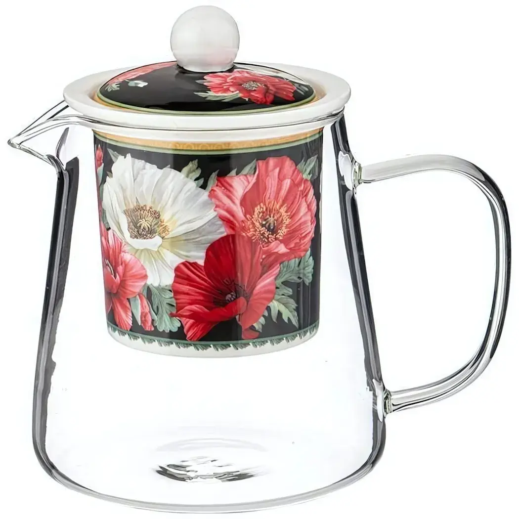 Чайник выполнен из высококачественного стекла и тонкостенного фарфора, что обеспечивает его легкость и прочность. Объем составляет 400 мл, что идеально подходит для заваривания нескольких чашек чая. Декор в виде цветущих маков на черном фоне придаёт ему уникальность и стиль. Размеры чайника позволяют удобно хранить его на кухне, а также использовать в качестве стильного элемента декора.