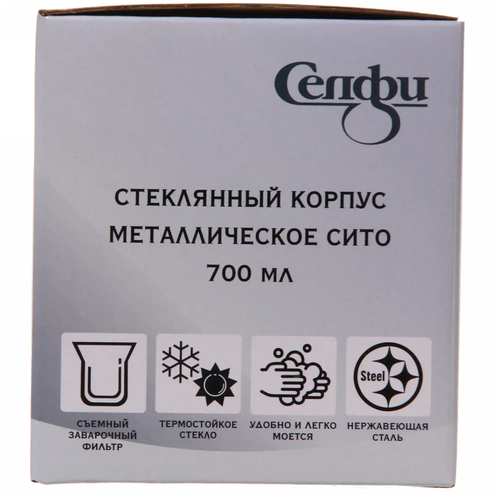 Представляем вашему вниманию стильный и функциональный заварочный чайник "Селфи" объемом 700 мл. Прозрачный стеклянный корпус позволяет контролировать процесс заваривания, а эргономичная зеленая ручка обеспечивает удобный захват даже при длительном использовании.