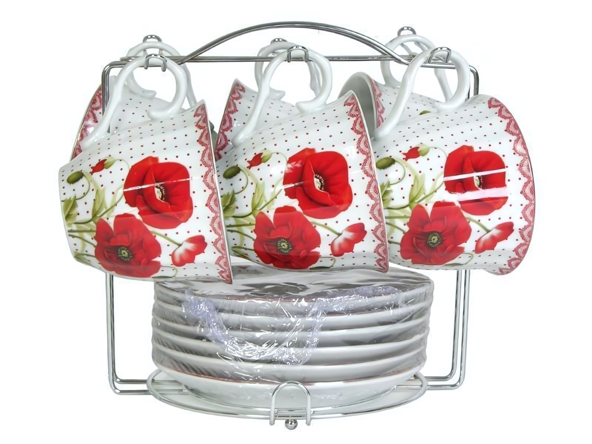 Чайный набор 12 предметов, фарфор, 230мл с металлической подставкой, декор «маки и горошек»