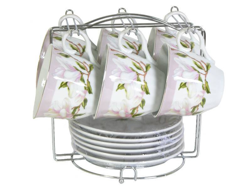 Чайный набор включает в себя кружки и тарелки, которые удобно размещены на металлической подставке. Это позволяет не только удобно хранить посуду, но и демонстрировать её в интерьере. Набор идеально подходит для сервировки чая или кофе для нескольких человек, что делает его отличным выбором для семейных встреч или дружеских посиделок.