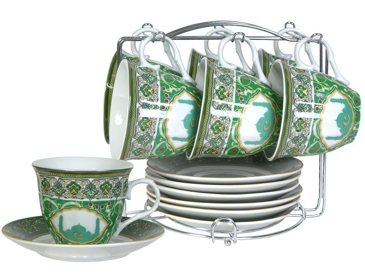 Чайный набор включает 6 чашек объемом 230 мл и 6 блюдец диаметром 14 см, что делает его идеальным для сервировки чая. Каждая чашка украшена изысканным зелёным узором с золотыми и красными элементами, а белые блюдца с тонкими золотыми полосками добавляют элегантности. Набор удобно размещается на металлической подставке с хромированным покрытием, что позволяет экономить место на столе и придаёт сервировке стильный вид.