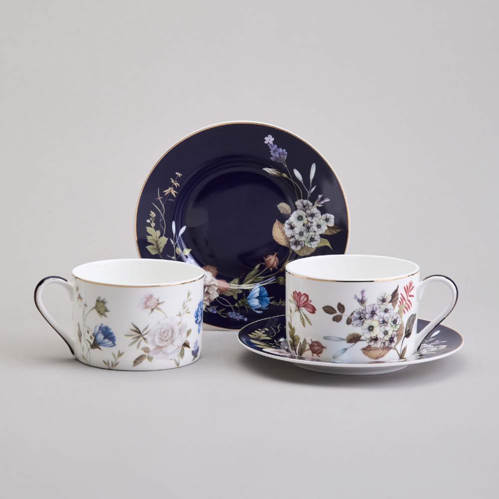Чайный набор включает две чашки и два блюдца, что делает его идеальным для уютных встреч с друзьями или романтических вечеров. Чашки имеют округлую форму и удобные ручки, что обеспечивает комфорт при использовании. Блюдца с рифленой каймой добавляют элегантности и стиля, а цветочный принт на белоснежном фоне создает гармоничное сочетание с темным фоном блюдец.