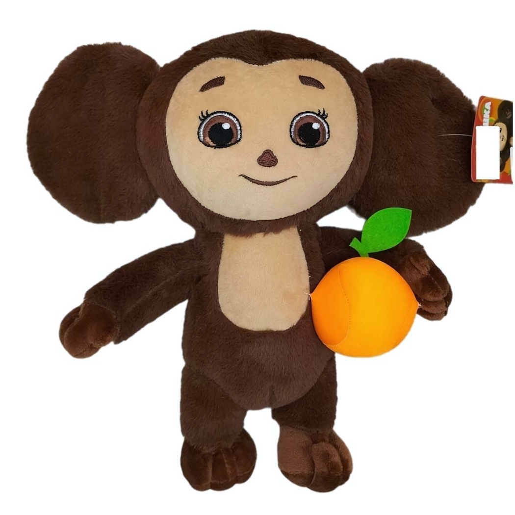 Размер упаковки составляет 18 х 12 х 32 см, а высота самой игрушки — 35 см. Чебурашка имеет коричневый цвет с бежевыми участками на лице и груди, а в правой руке держит оранжевый фрукт в форме апельсина с зеленым листком. Эта игрушка не только развлекает, но и радует глаз своим дружелюбным образом.