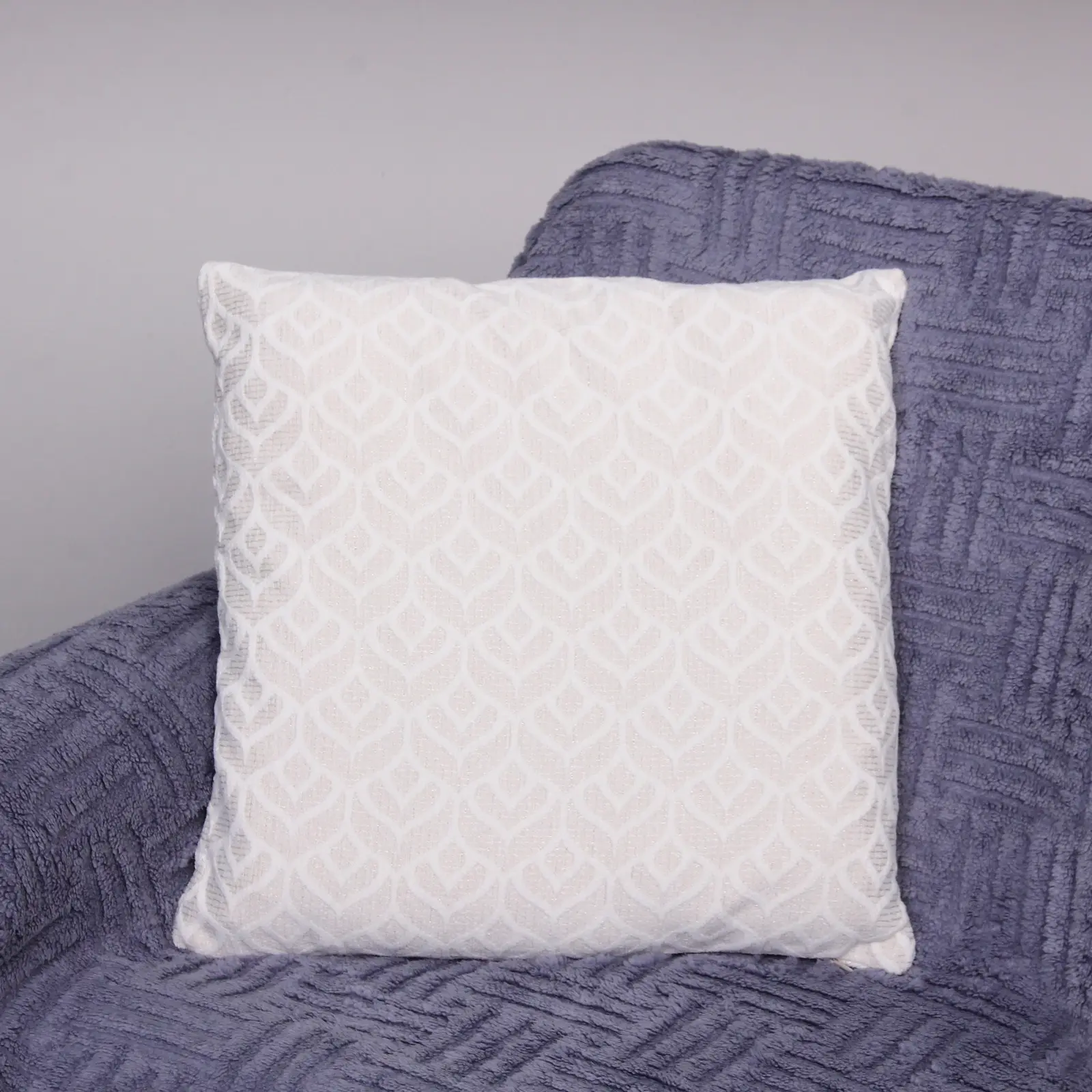 Размер 43x43 см точно подходит для стандартных декоративных подушек. Материал — 100% полиэстер с фактурой, имитирующей ткань с узором в виде листьев или каплей. Цвет молочный придает свежести и легко сочетается с разными оттенками мебели и текстиля.