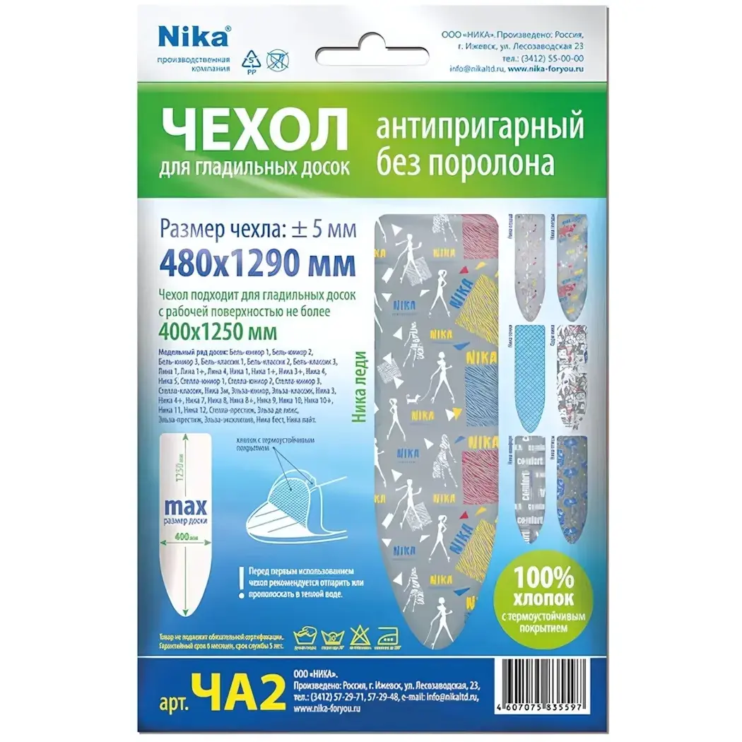 Чехол имеет оптимальные размеры 480х1290 мм (±5 мм) и отлично подходит для большинства стандартных гладильных досок. Перед первым использованием рекомендуется распаковать изделие в теплом помещении для восстановления формы.