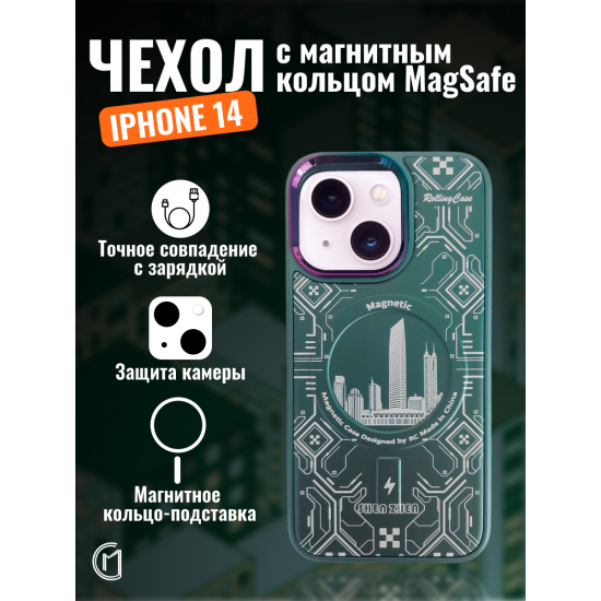 Чехол создан для повседневной эксплуатации: магнитное кольцо служит подставкой для просмотра видео, а закрытые кнопки предотвращают попадание пыли. Совместим с iPhone 14 и аксессуарами Apple MagSafe.