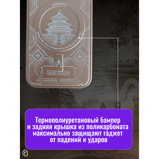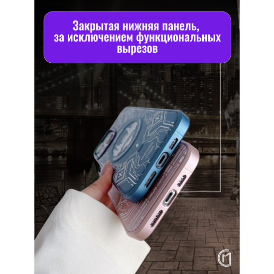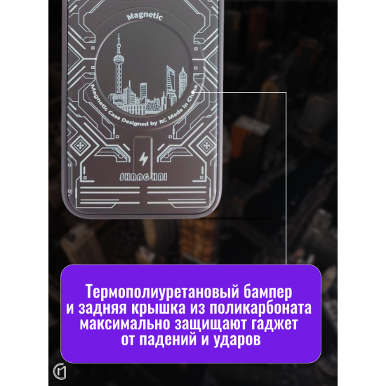 Чехол изготовлен из комбинации термополиуретана и поликарбоната: гибкий бампер поглощает удары, а прозрачная задняя панель демонстрирует оригинальный дизайн вашего iPhone. Уникальный принт с архитектурными мотивами и электронными схемами добавляет индивидуальности аксессуару.