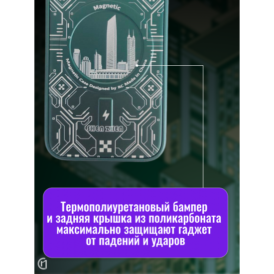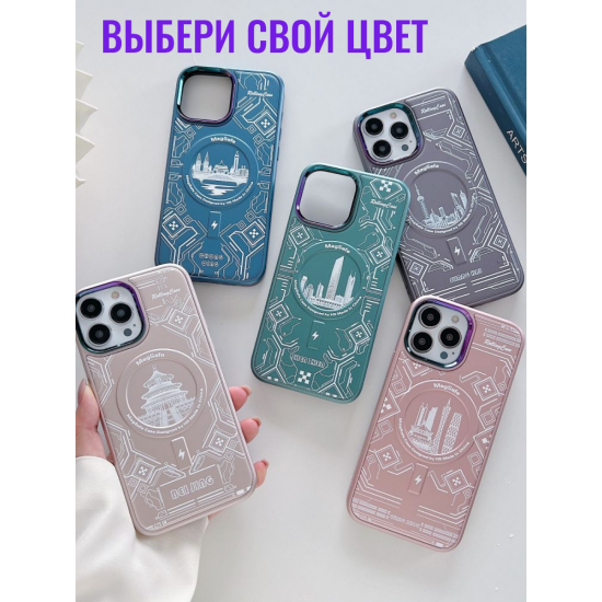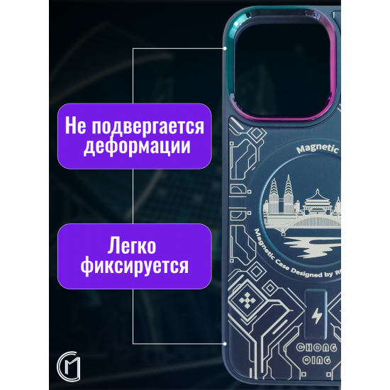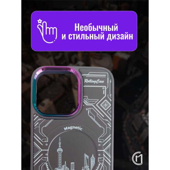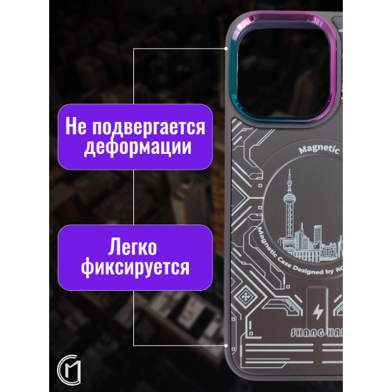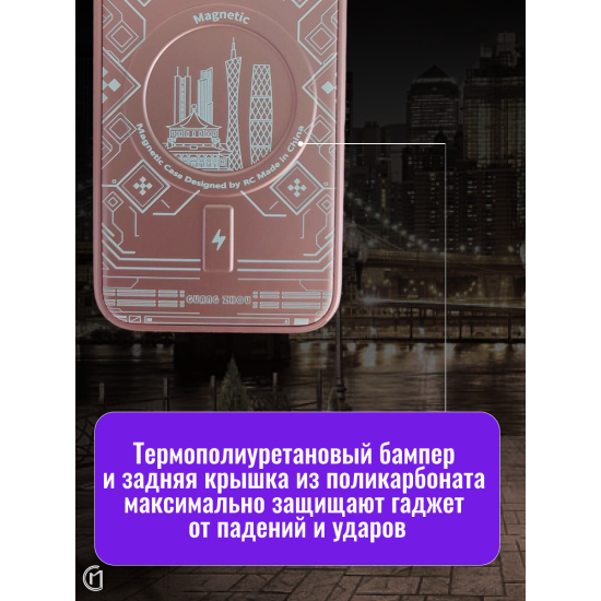 Чехол имеет оригинальный дизайн с элементами городского пейзажа и графическими узорами. Сочетание прозрачного материала с цветными акцентами создает современный и стильный внешний вид. Магнитное кольцо-подставка позволяет удобно использовать устройство в горизонтальном положении.
