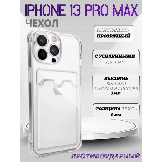 Чехол-бампер для iPhone 13 Pro Max, прозрачный силикон с карманом, усиленные углы 3 мм