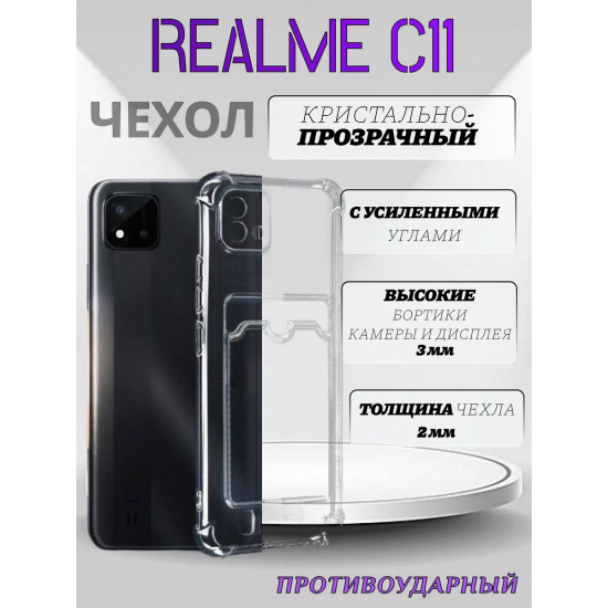 Чехол силиконовый прозрачный с карманом для Realme C11 (2021), 2 мм, усиленные углы