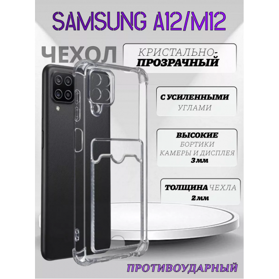 Чехол-бампер прозрачный с карманом для Samsung Galaxy A12/M12, противоударный, усиленные углы, 2 мм