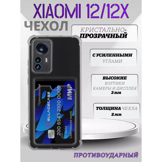 Чехол силиконовый прозрачный с карманом для карт, Xiaomi 12/12X, защита углов, 2мм