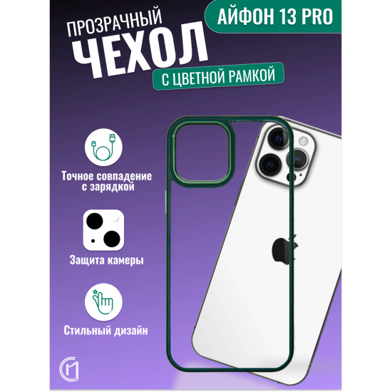 Чехол силиконовый прозрачный с цветной рамкой для iPhone 13 Pro, зеленый, защита камеры и экрана