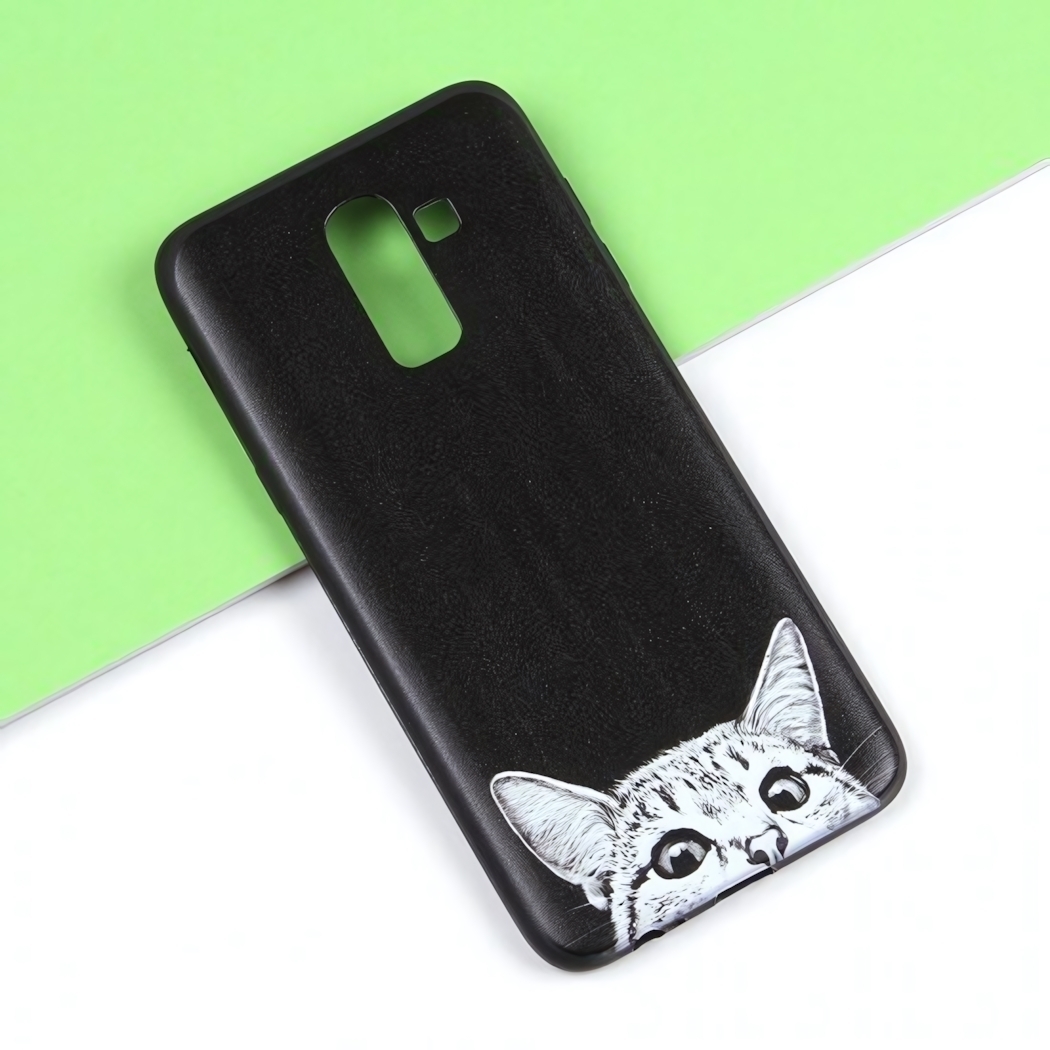 Чехол TPU для Samsung Galaxy J8 (2018), черный, матовый, рисунок кота, защита от царапин, вырезы под камеру и кнопки