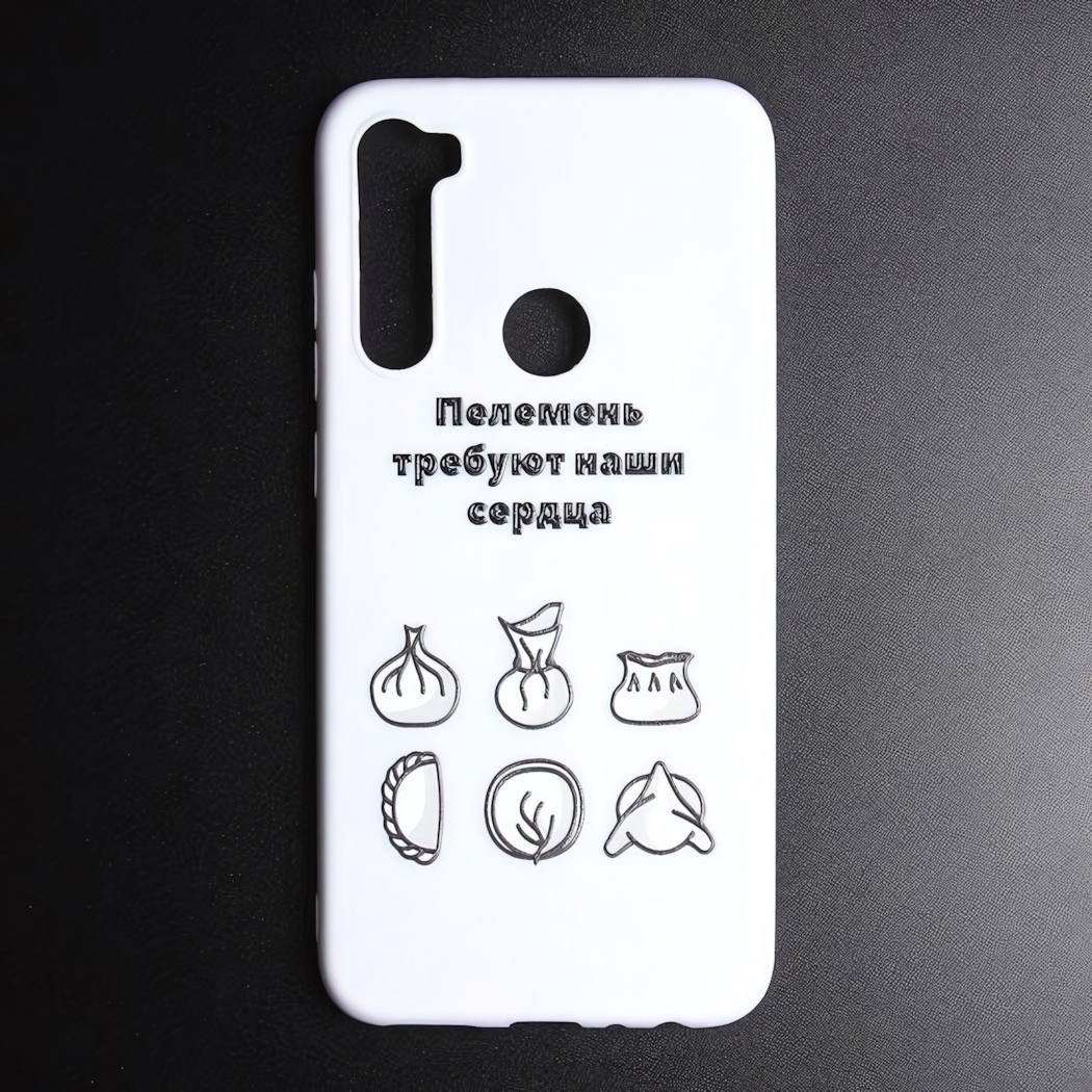 Преимущества этого чехла заключаются в его долговечности и практичности. Он выполнен из белого полиуретана, который не только защищает от царапин и ударов, но и легко очищается от загрязнений. Уникальный дизайн с изображениями пельменей и текстом «Пельмень требуют наши сердца» добавляет нотку юмора и оригинальности.