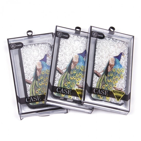 Объёмный 3D-рисунок с павлином создан методом лазерной гравировки — он не стирается при эксплуатации. Двухслойная конструкция из пластика и термополиуретана сочетает жёсткость задней панели с гибкостью боковин. Чёрный кант по периметру маскирует следы использования.