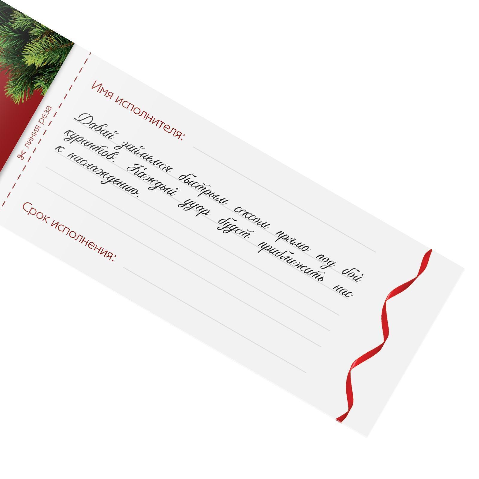Чековая книжка с 20 желаниями в праздничном оформлении станет идеальным дополнением взрослой игры. Красочный дизайн с золотыми акцентами и тематическими элементами подарит незабываемые эмоции и поможет раскрыть ваши самые смелые фантазии.