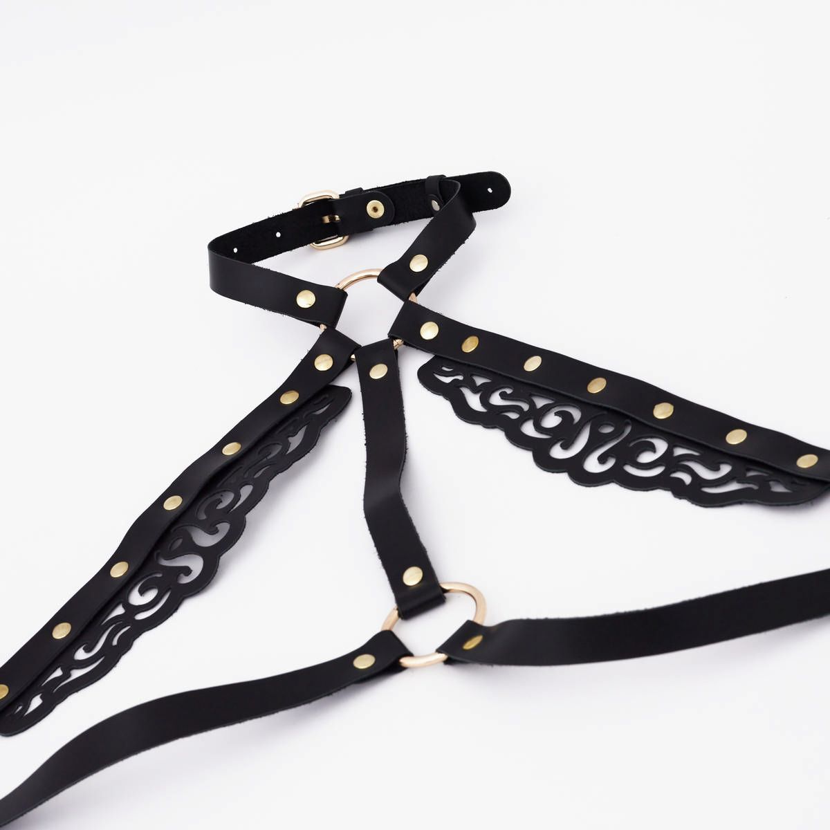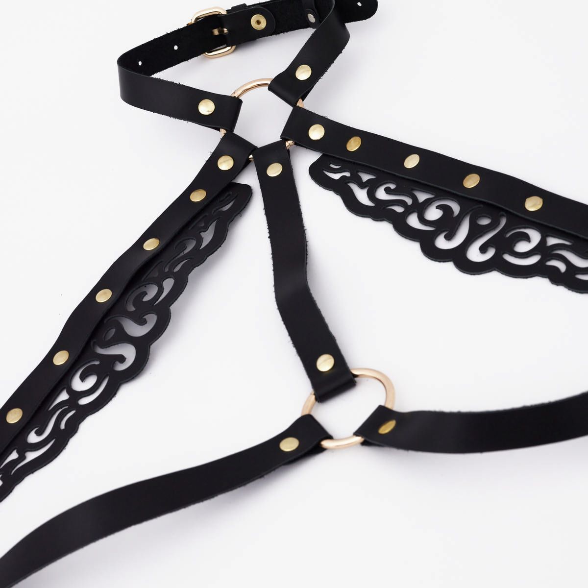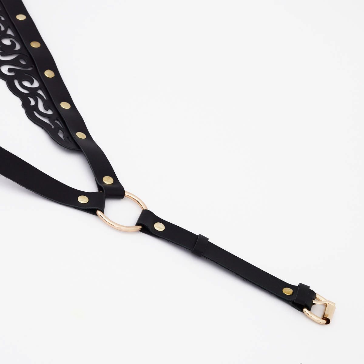 Изделие выполнено из натуральной кожи, которая обеспечивает мягкость, долговечность и приятные тактильные ощущения. Золотистая металлическая фурнитура добавляет прочности и благородного блеска. Резные элементы делают дизайн более изящным, акцентируя внимание на красоте тела.