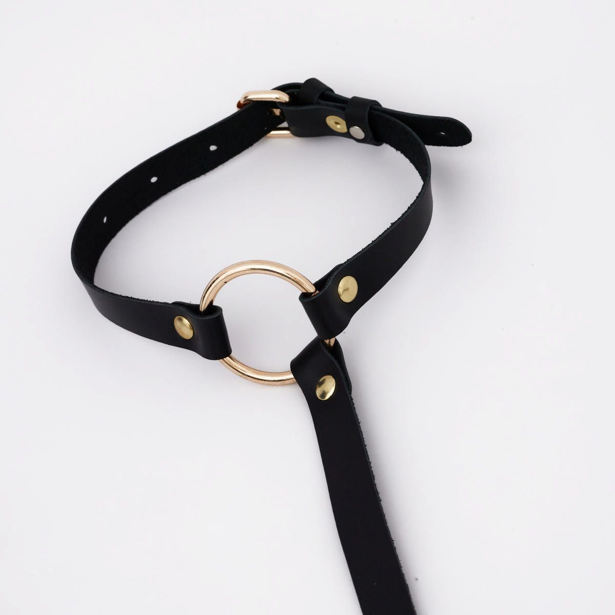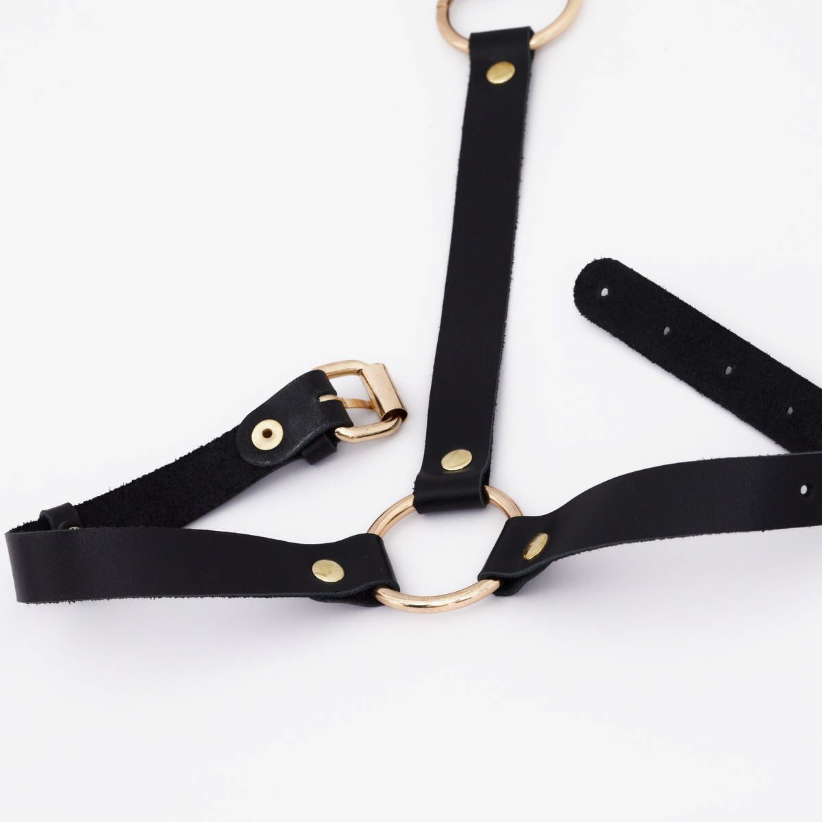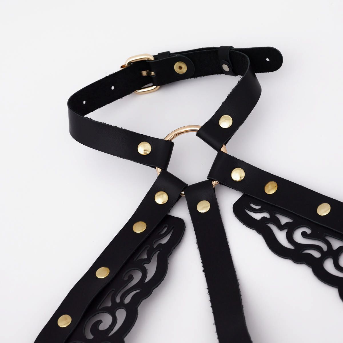 Изделие выполнено из натуральной кожи, которая обеспечивает мягкость, долговечность и приятные тактильные ощущения. Золотистая металлическая фурнитура добавляет прочности и благородного блеска. Резные элементы делают дизайн более изящным, акцентируя внимание на красоте тела.