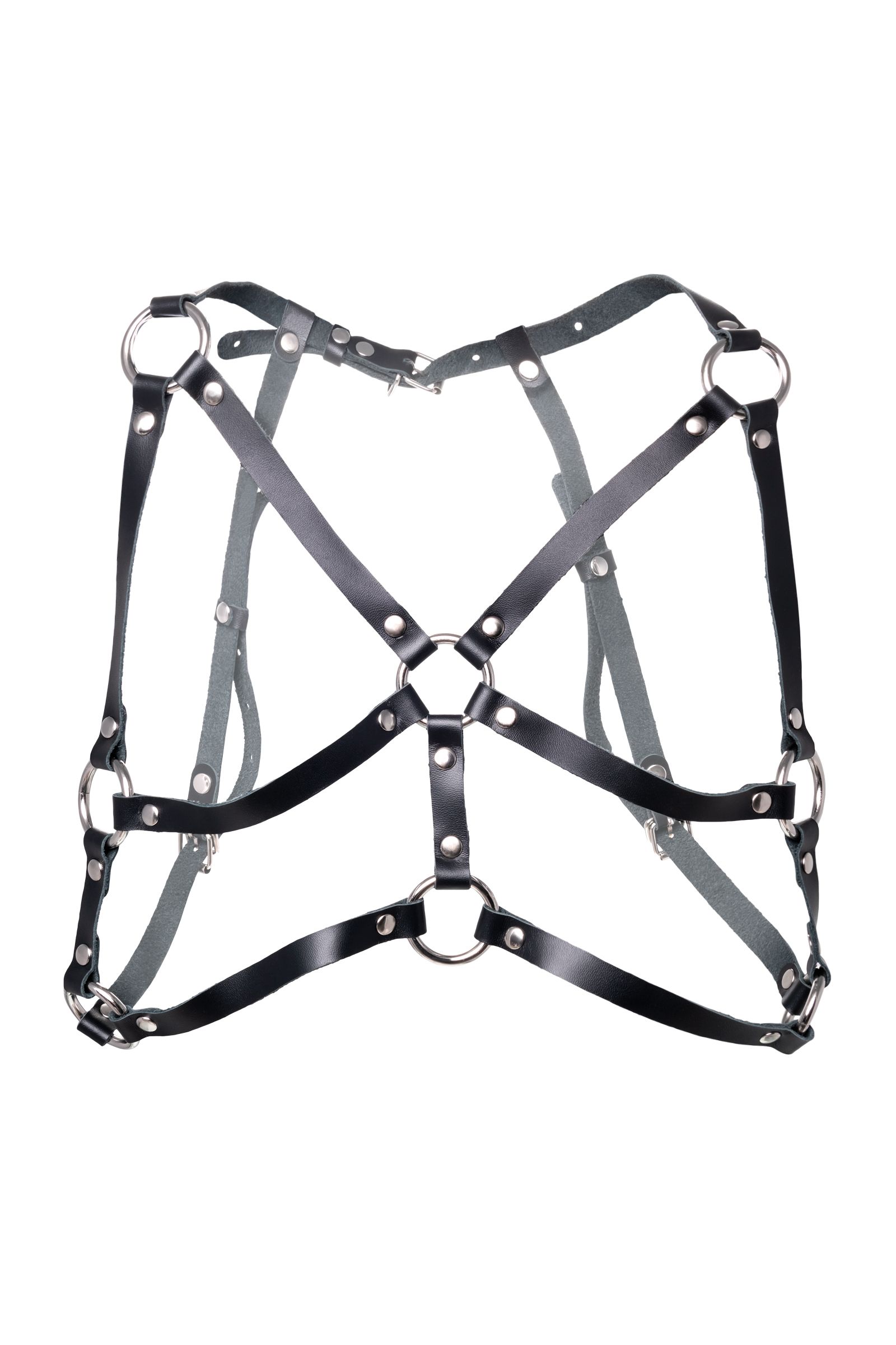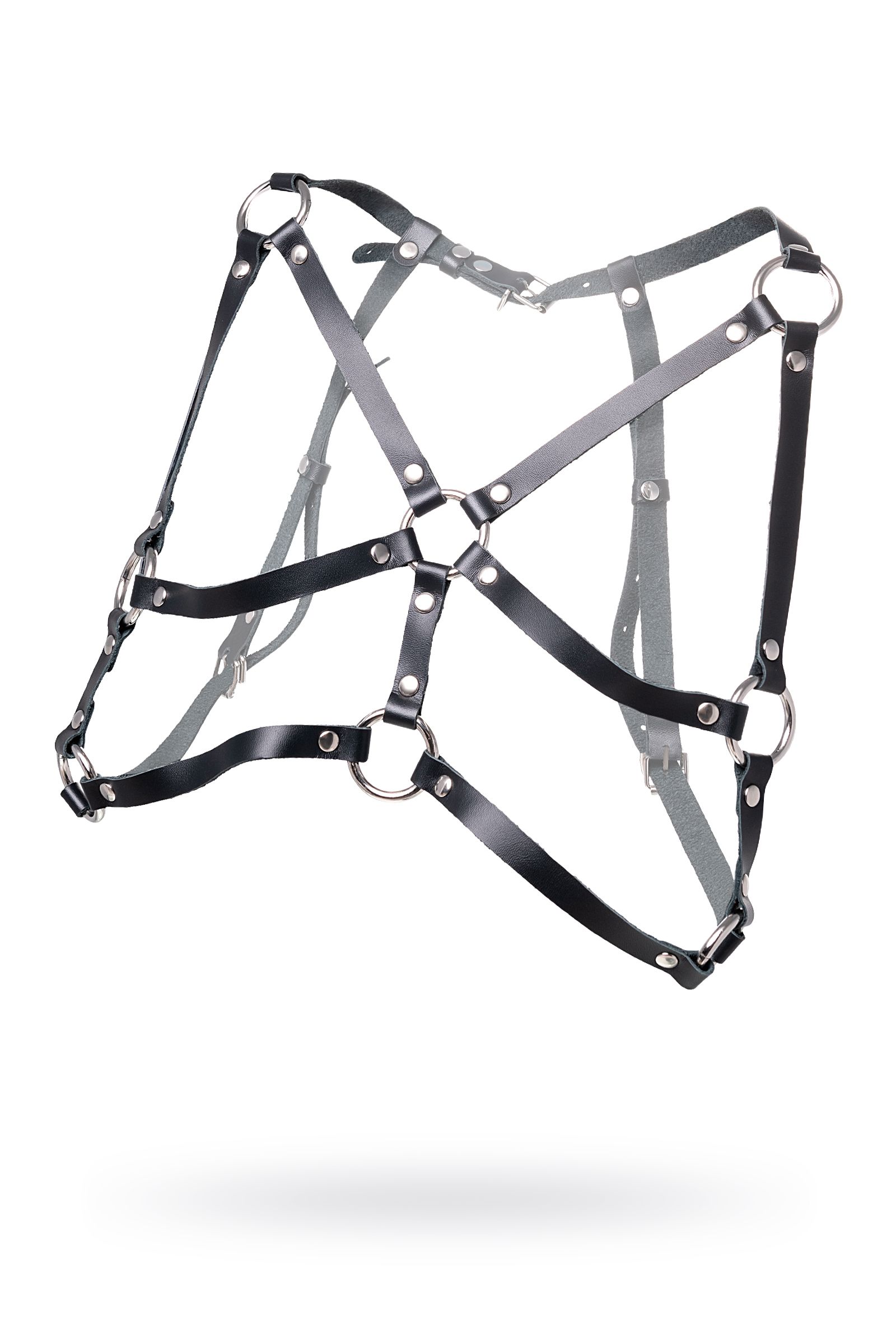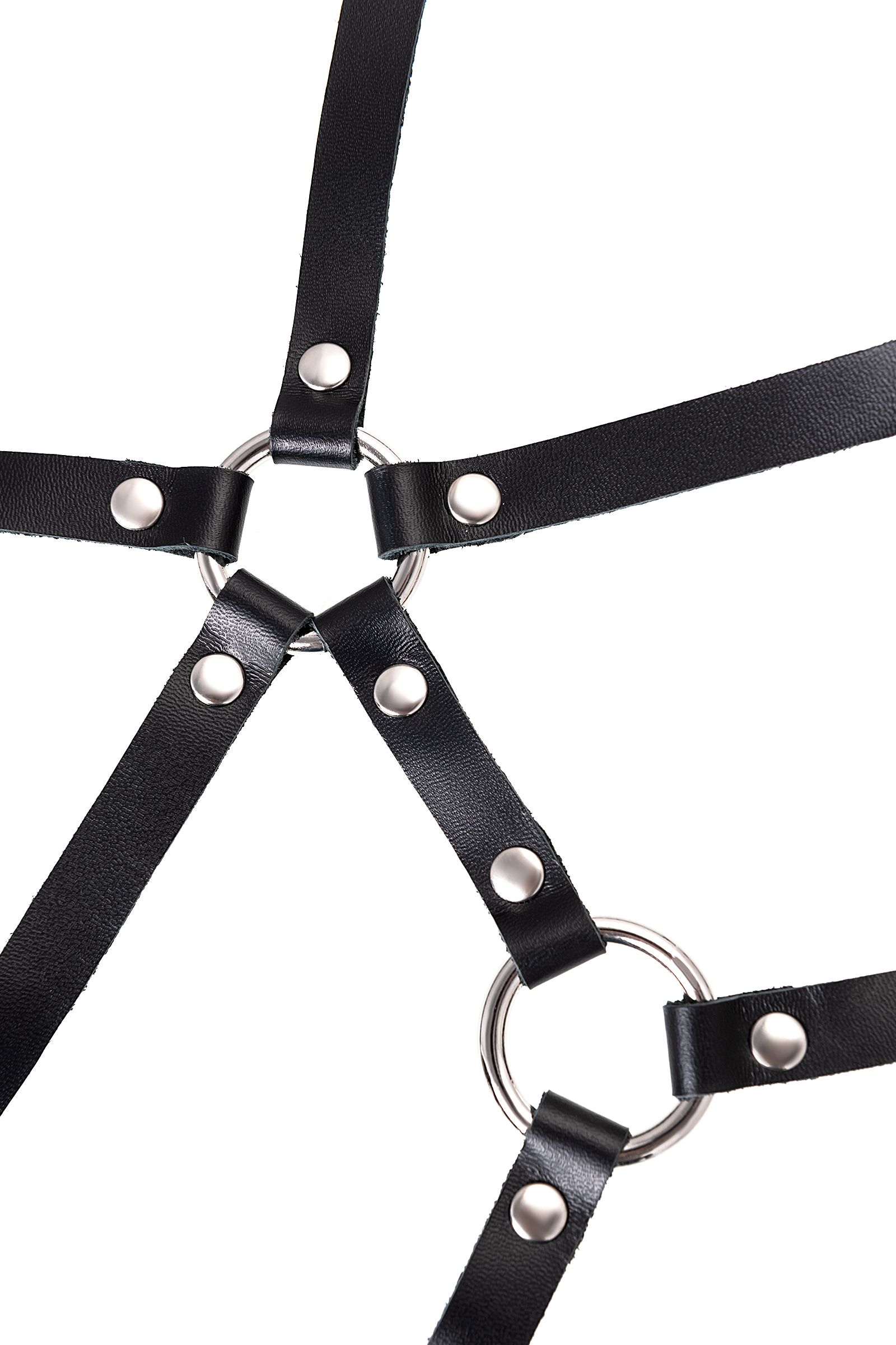 Портупея выполнена из натуральной кожи черного цвета с металлической фурнитурой. Тонкие ремни соединены стальными кольцами, образуя симметричный рисунок на груди. Конструкция продумана так, чтобы аксессуар не только выглядел эффектно, но и обеспечивал поддержку и комфорт при ношении.