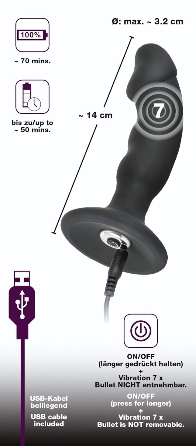 Рабочая длина 12.5 см оптимальна для комфортного использования. Встроенный аккумулятор заряжается через USB-кабель (в комплекте) — полной зарядки хватает на 50-70 минут непрерывной работы. Диаметр 3.2 см обеспечивает деликатное введение.
