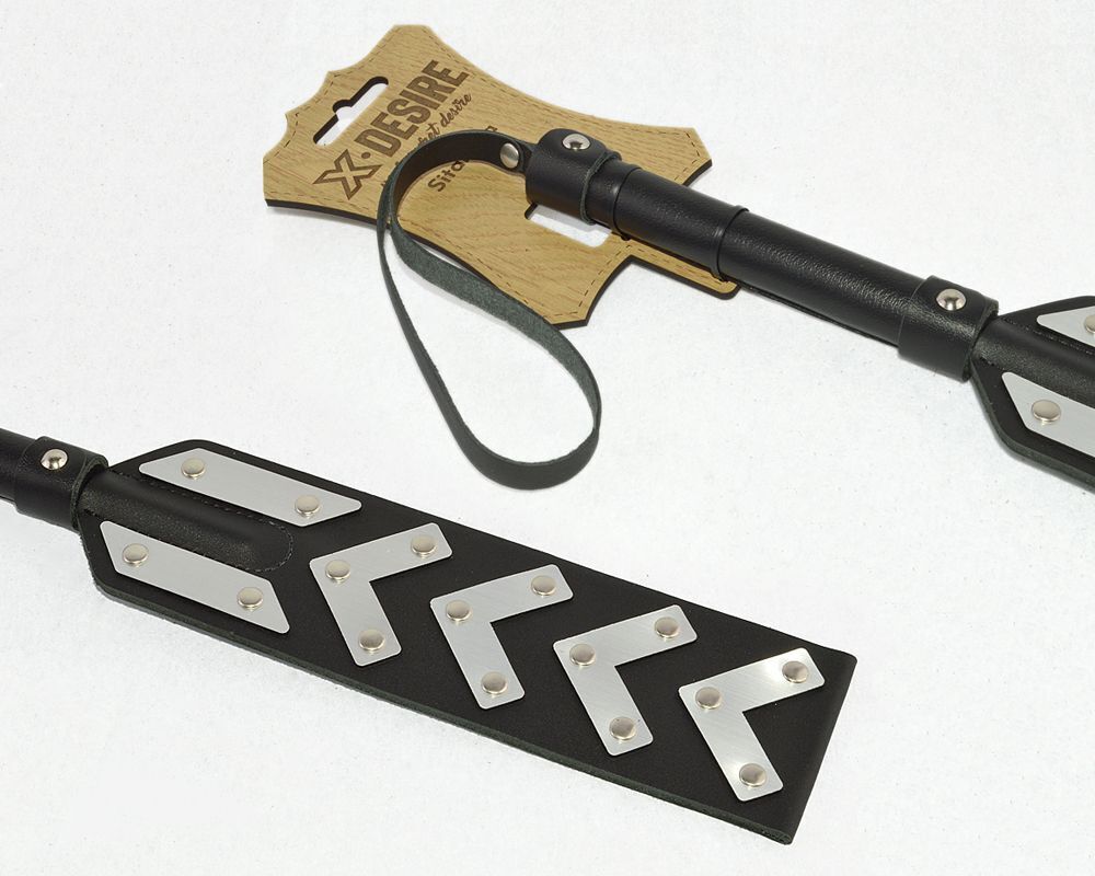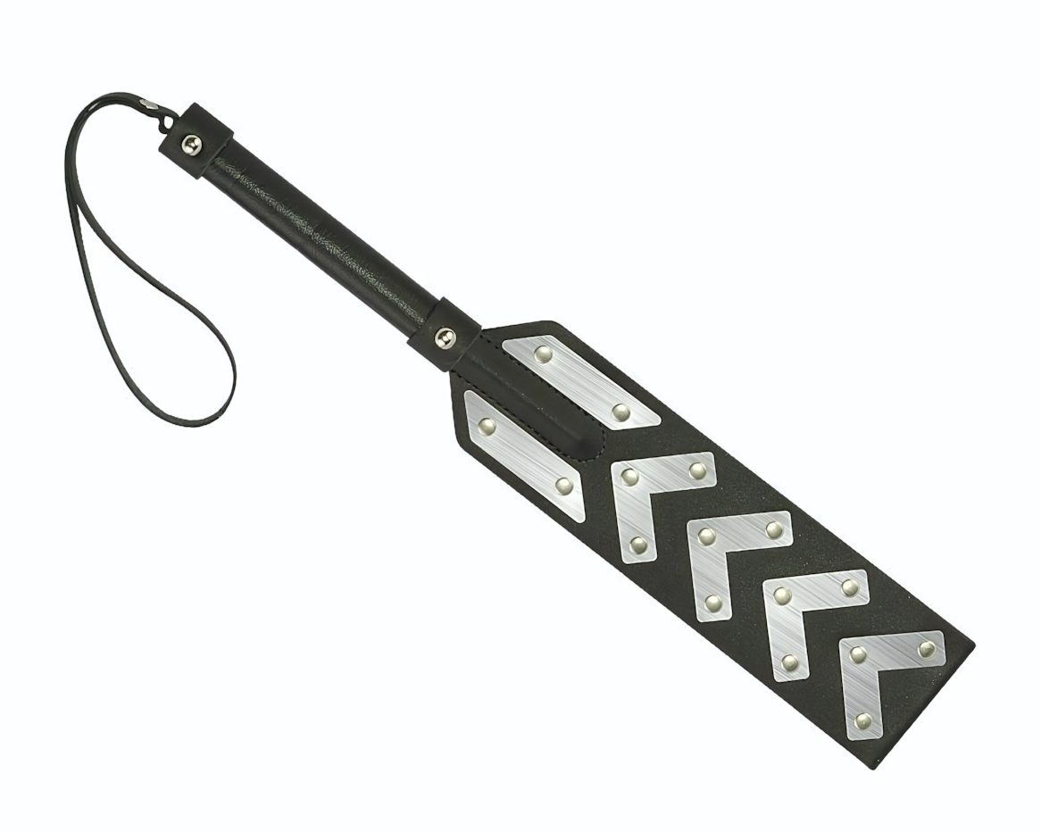 Эта шлепалка станет идеальным аксессуаром для любителей BDSM и садомазохистских игр. Изготовленная из натуральной кожи, она сочетает в себе комфорт и стиль, позволяя вам наслаждаться каждым моментом. Черный цвет с серебристыми вставками придаёт изделию элегантный вид, а текстурированная ручка обеспечивает надёжный хват.