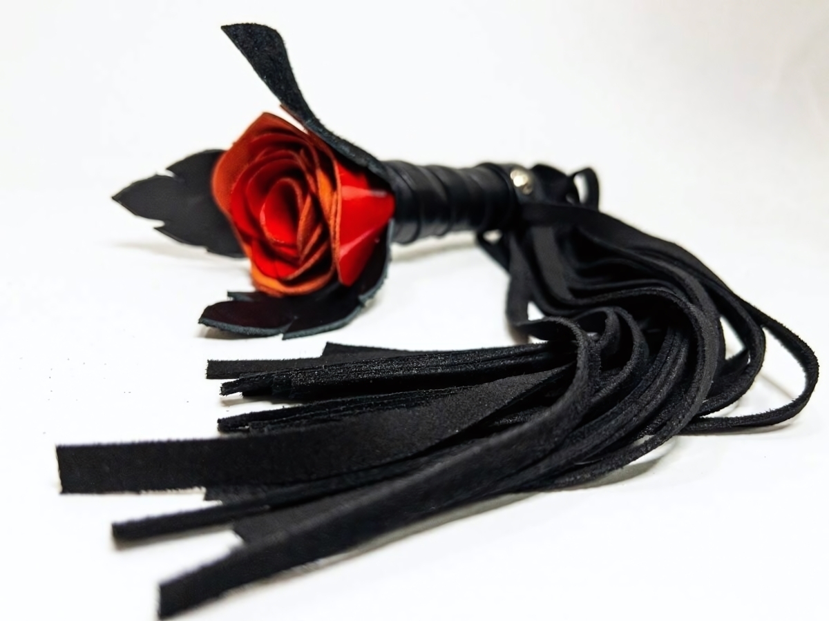 Плеть из натуральной кожи с лаковой розой в рукояти сочетает эстетику и функциональность. Изысканный дизайн с контрастом черной замши и алой розы создает атмосферу таинственности, а тщательная проработка деталей гарантирует комфорт использования.