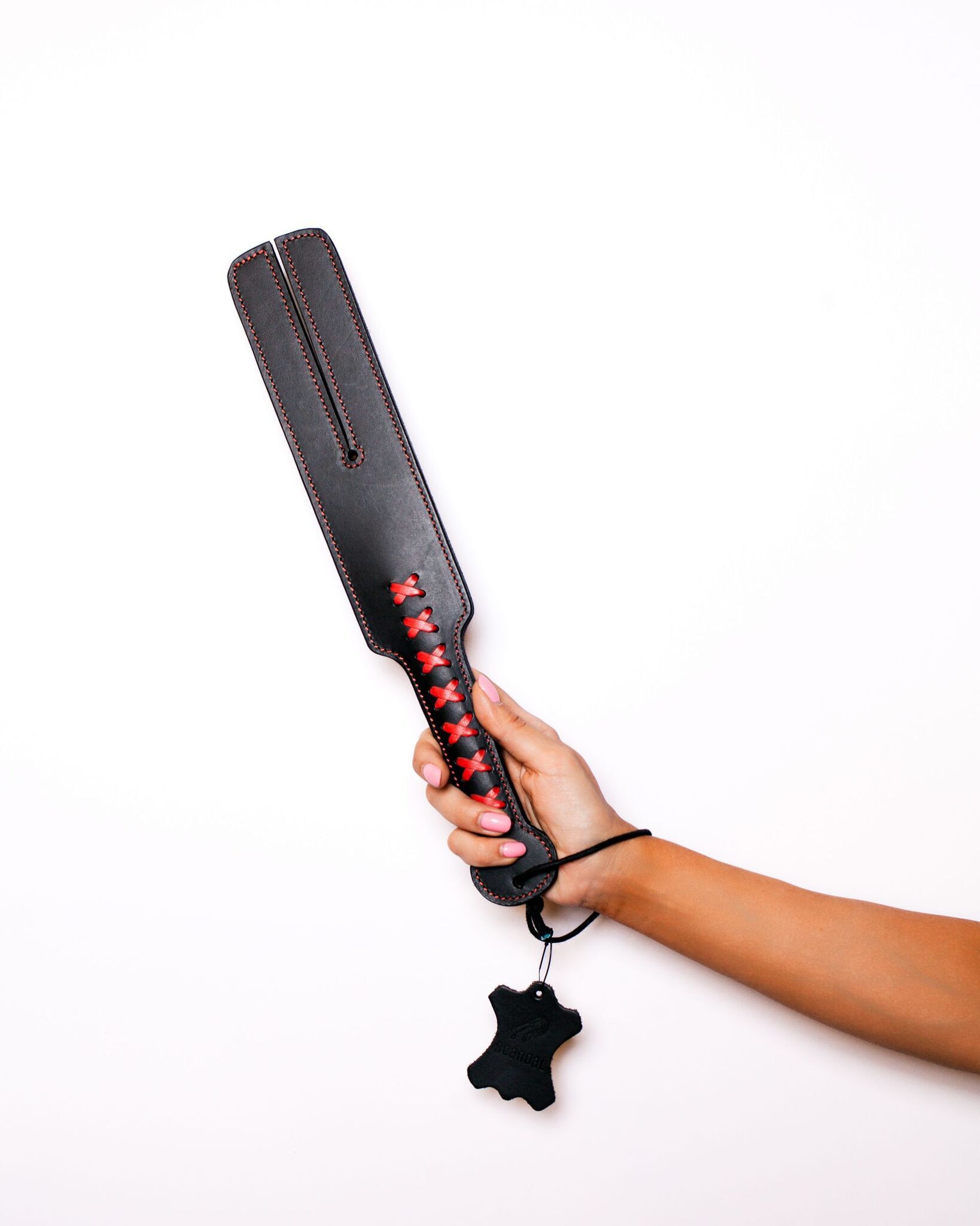 Пэддл для БДСМ Scandal из натуральной кожи, удобная ручка, черно-красный дизайн, 38.5 см