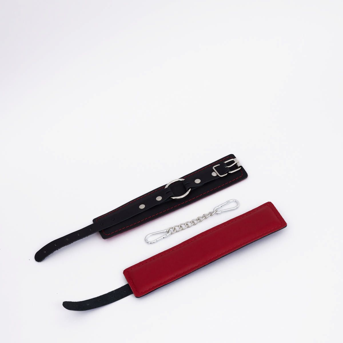 Манжеты кожаные для BDSM с мягкой подкладкой, черно-красные, цепочка 33 см, 25.5х7 см