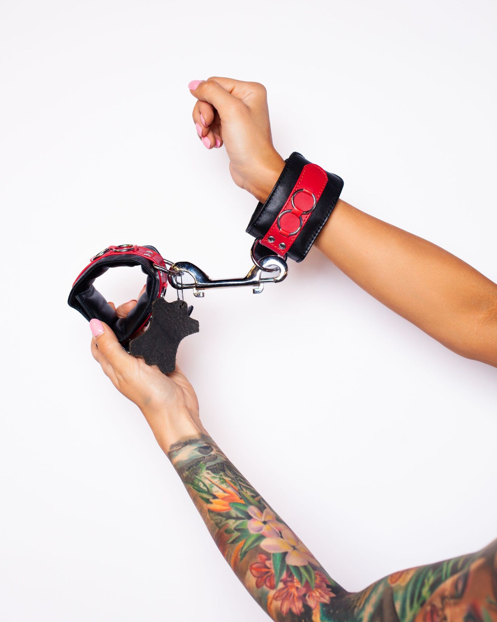 Наручники кожаные 'Scandal', черные/красные, регулируемые, обхват 26-29см