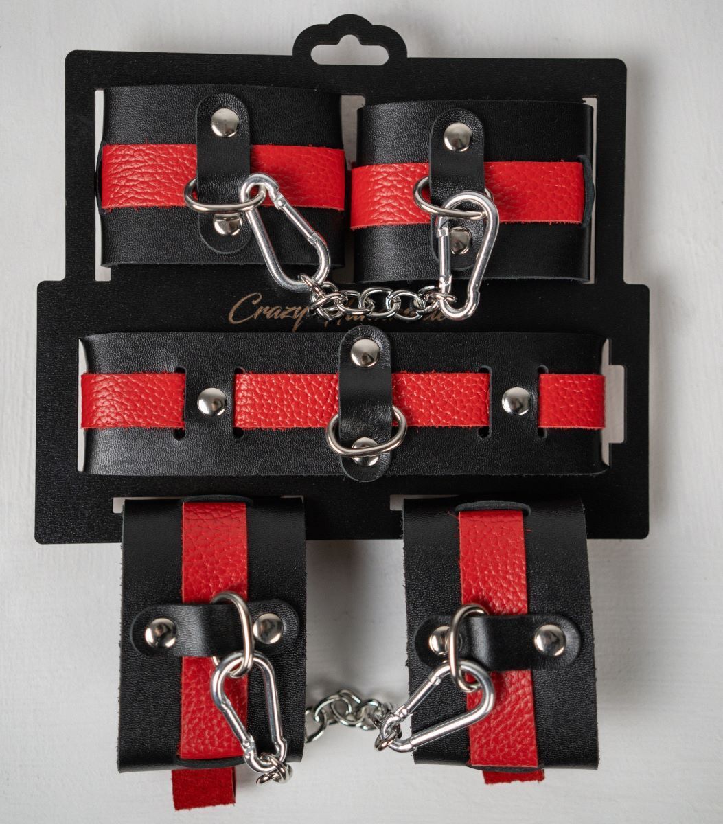Этот комплект из натуральной кожи подарит незабываемые ощущения и раскроет новые грани чувственности. В комплект входят три базовых элемента: стильный ошейник, надежные наручники и прочные оковы.