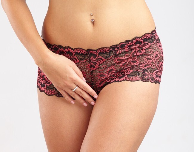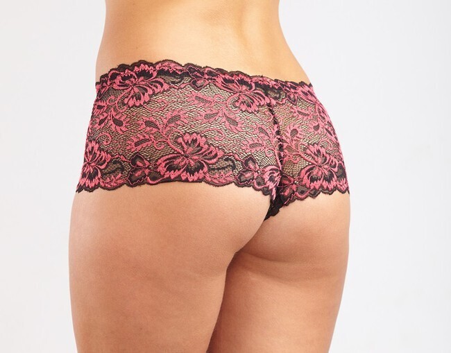 - Двухслойная ткань: чёрная сетчатая основа с малиновыми кружевными аппликациями создаёт эффект игривой полупрозрачности