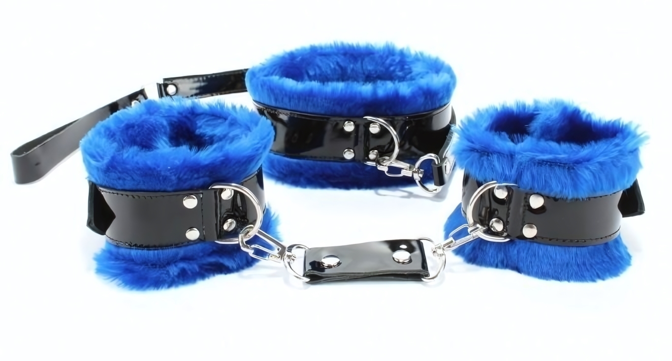 Почему стоит выбрать именно этот комплект? Во-первых, он выполнен из высококачественных материалов: синего эко-меха и черной лакированной кожи, что гарантирует долговечность и практичность. Во-вторых, нежный мех делает использование аксессуаров максимально комфортным, позволяя вам наслаждаться каждым моментом.