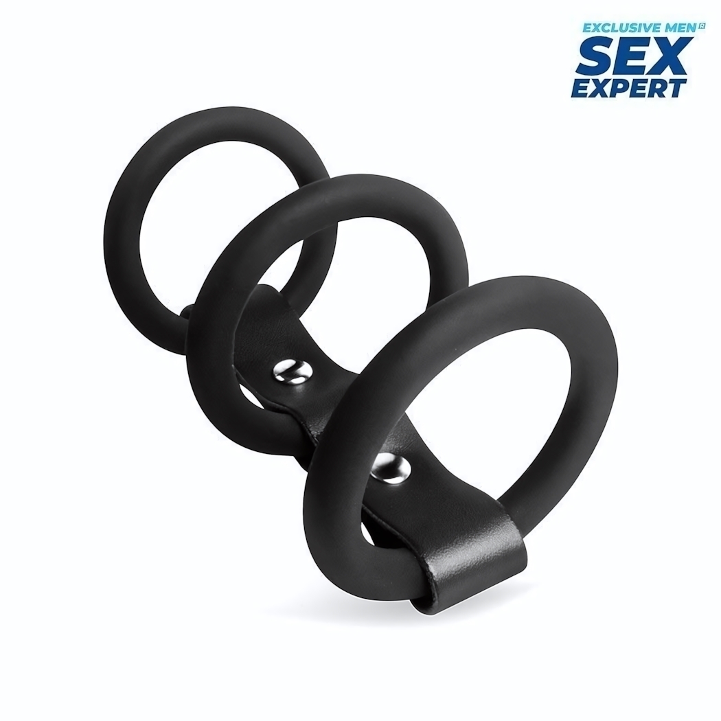 Кольцо надевается на половой член, а третье кольцо – на мошонку. Все три кольца соединены прочным ремешком, что обеспечивает надежную фиксацию и комфорт во время использования. Изделие изготовлено из мягкого эластичного силикона, который хорошо растягивается и дарит приятные тактильные ощущения.