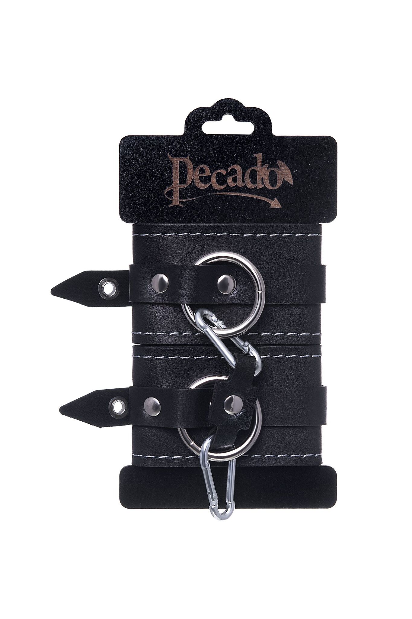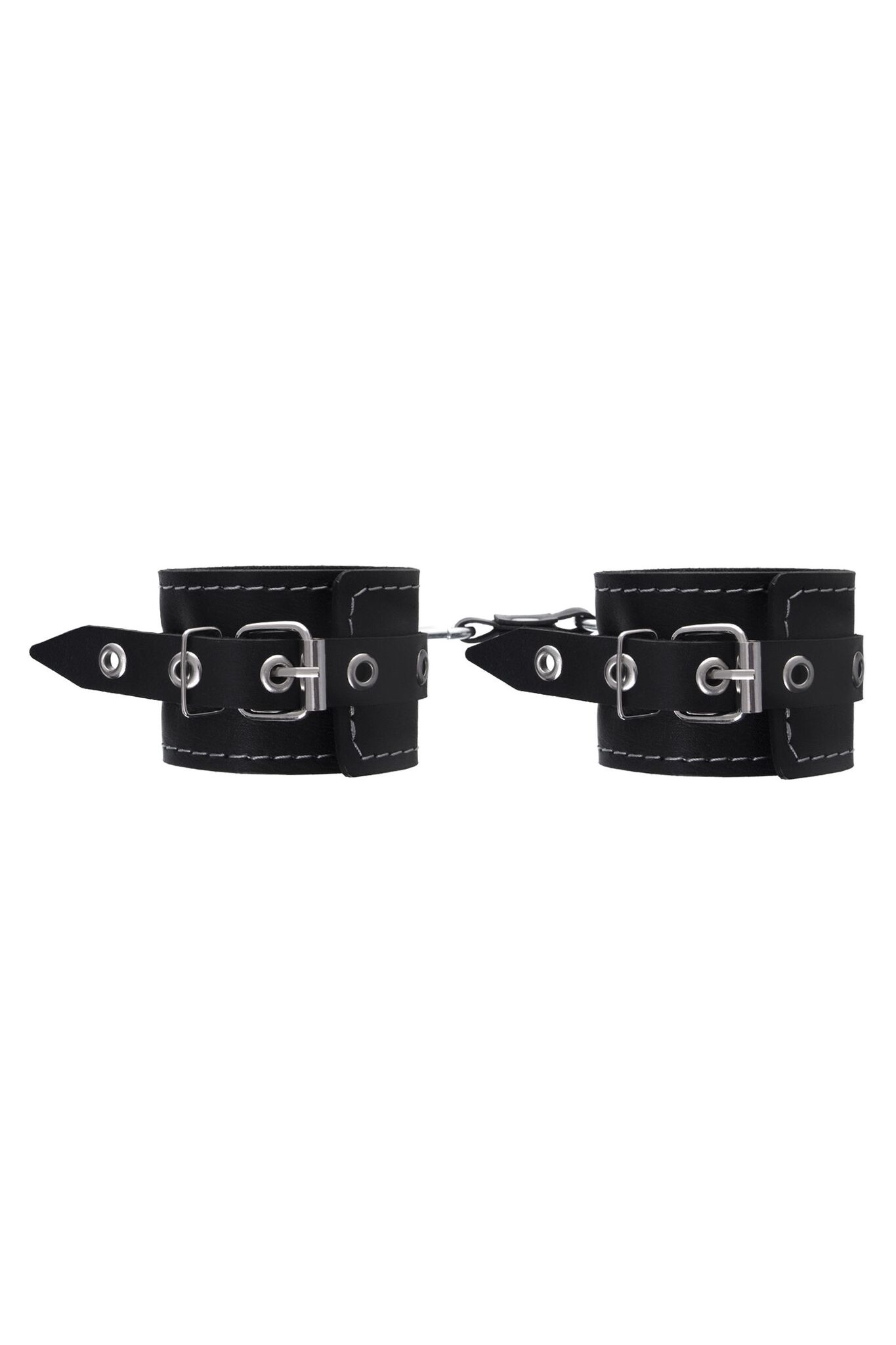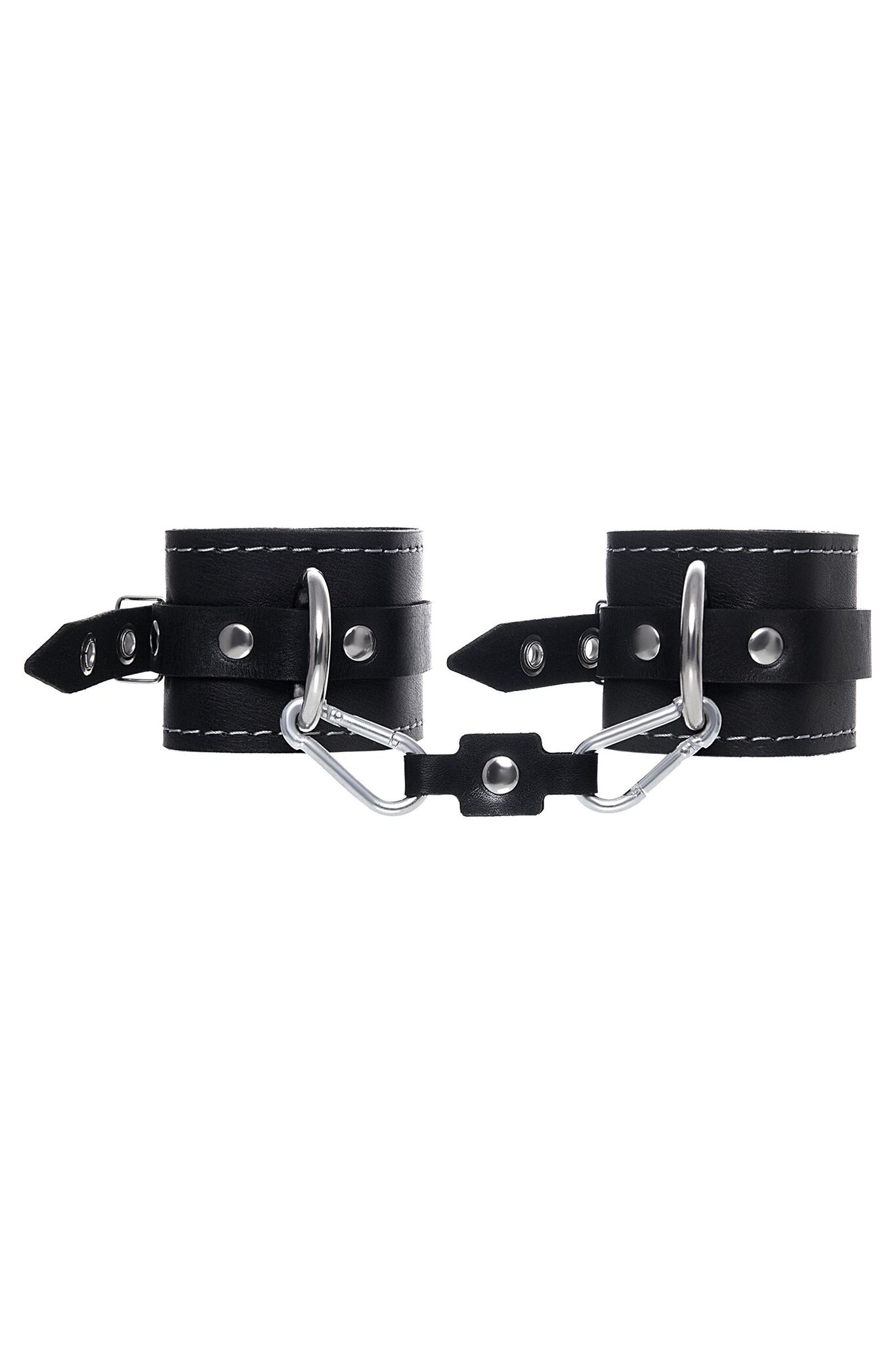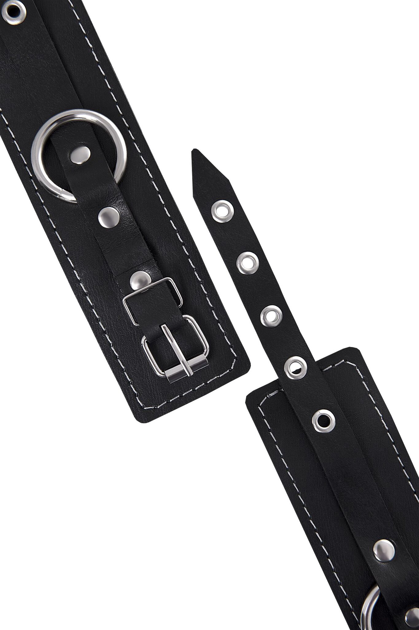 Наручники кожаные регулируемые с металлическими кольцами, черные, белая строчка, 20 см