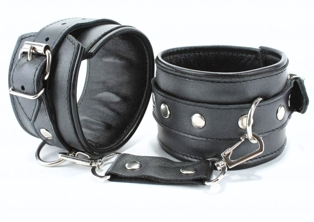 Эротические черные кожаные наручники с клепками