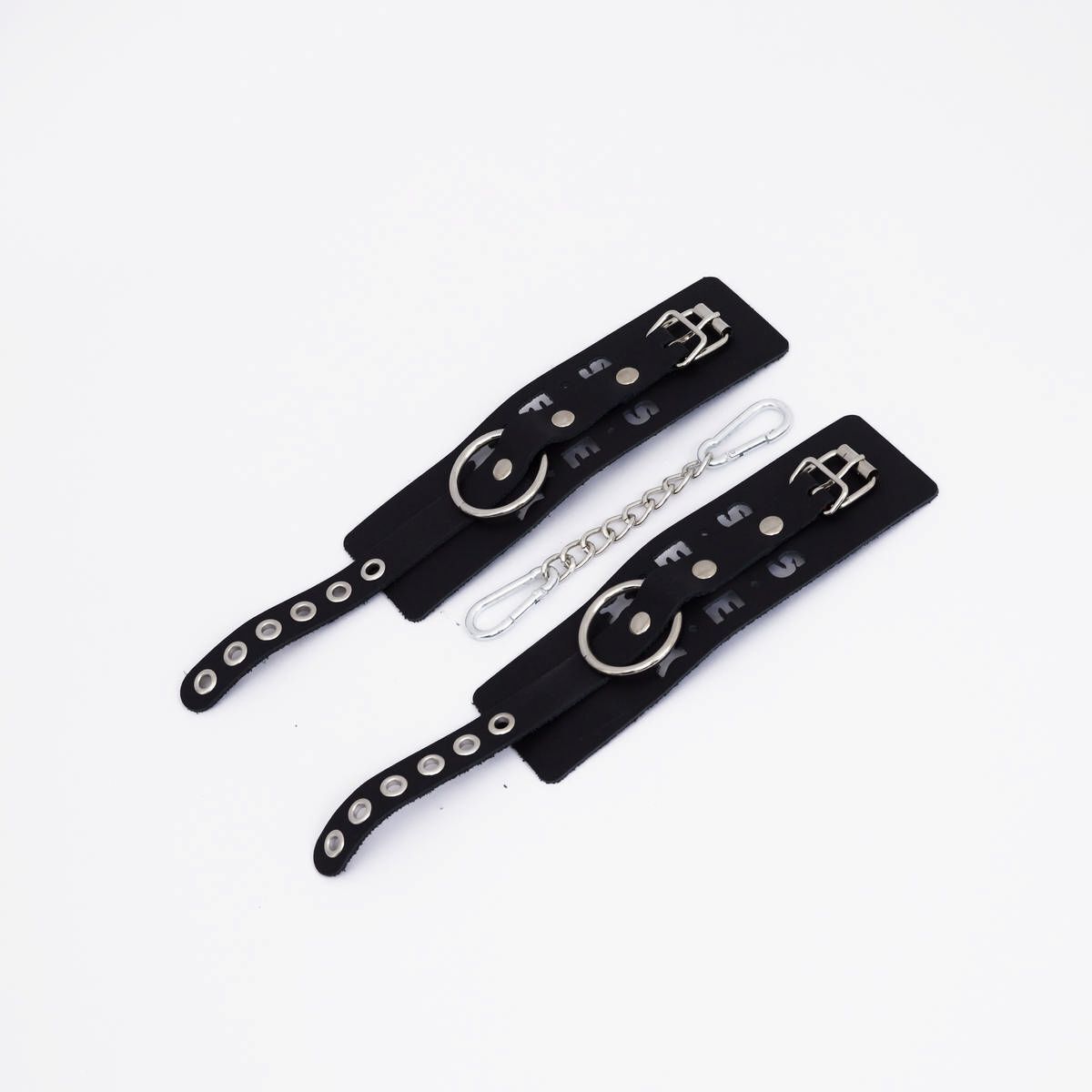 Наручники кожаные регулируемые, черные, стальные кольца, надпись SEX, размер 18,5х7см
