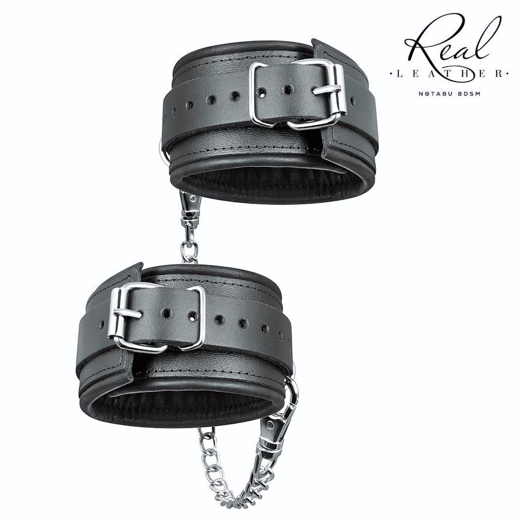 Кожаные оковы 'Real Leather' черные, регулируемые, с цепочкой и карабинами
