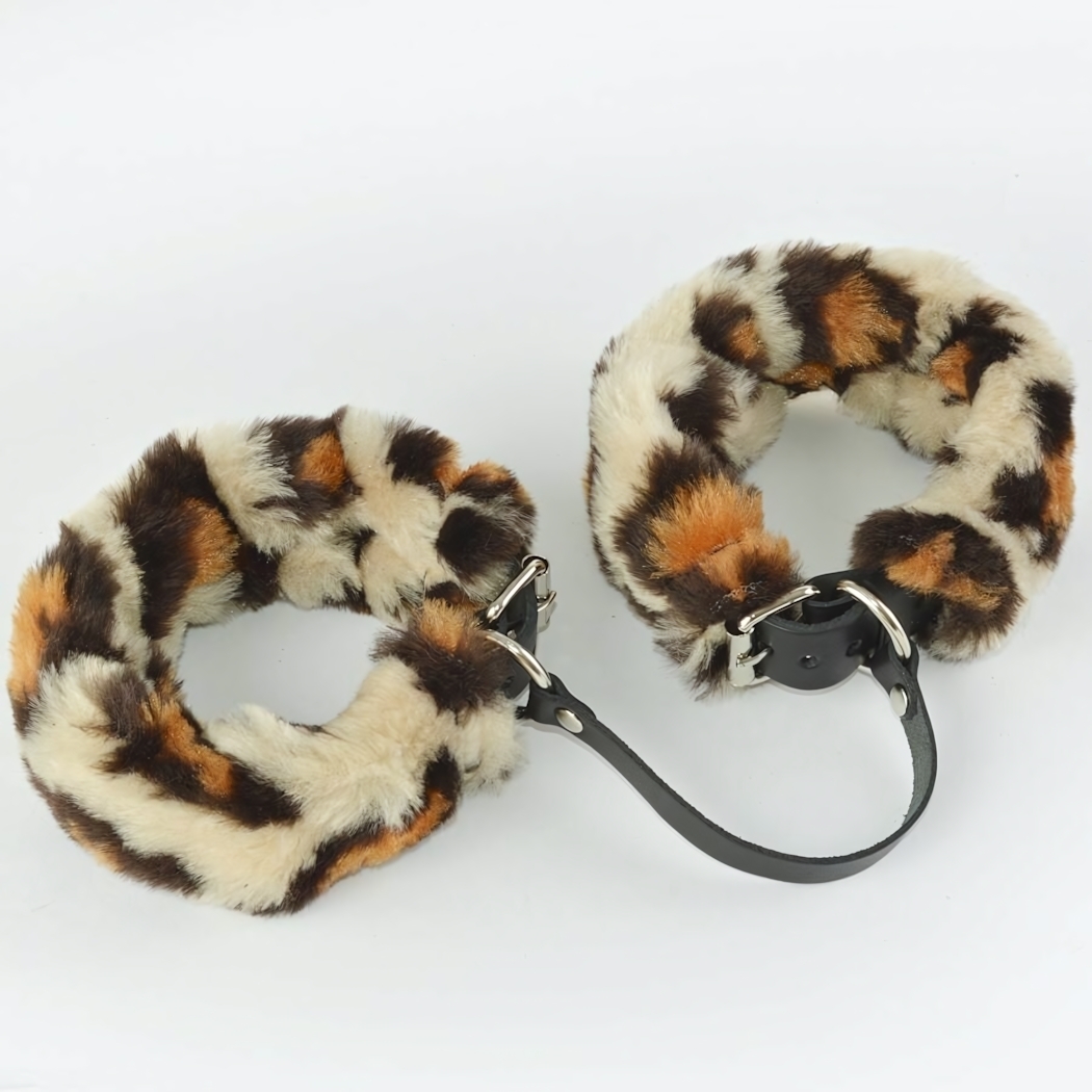 Оковы кожаные со съемной опушкой, черные/леопардовые, регулируемые