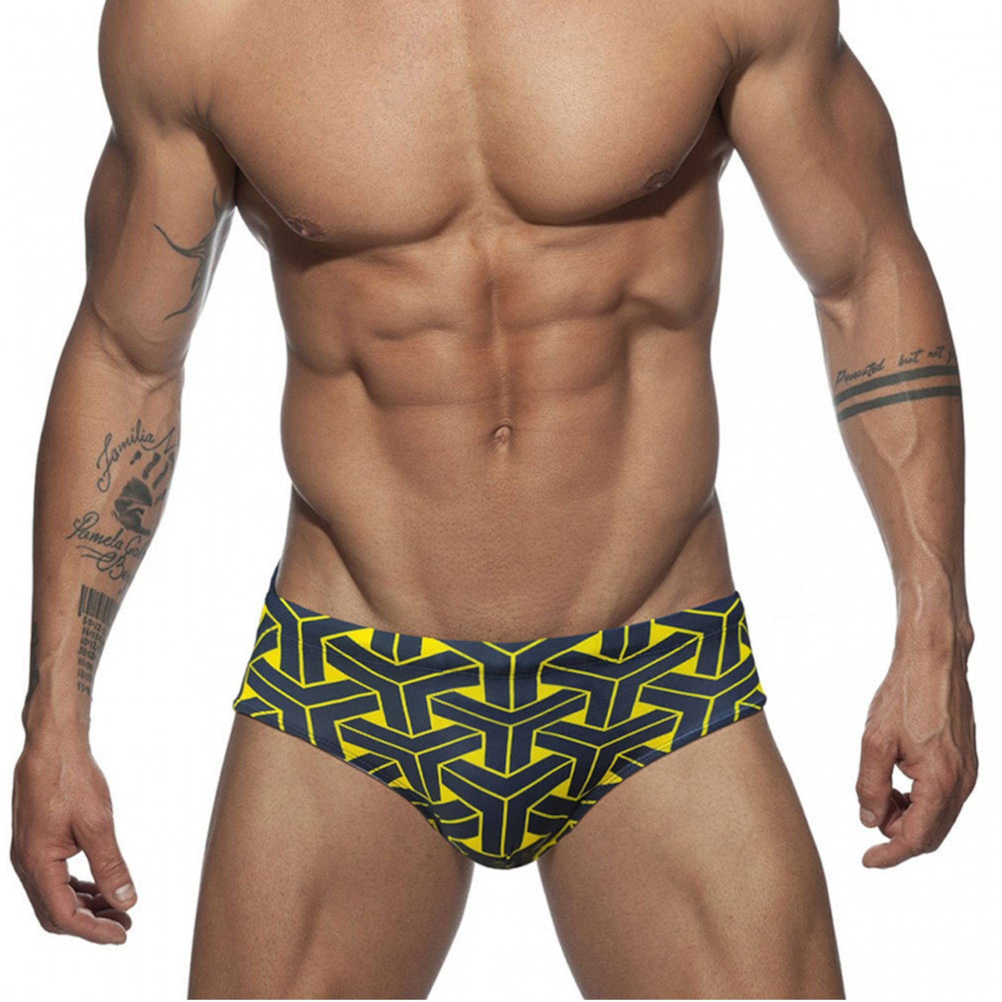 Размер: M. Цвет: черный с ярким геометрическим узором в желтых и темно-синих тонах. Материал: 80% полиамид, 20% эластан. Эти плавки станут отличным дополнением к вашему летнему гардеробу и помогут вам чувствовать себя уверенно и комфортно в любой ситуации.