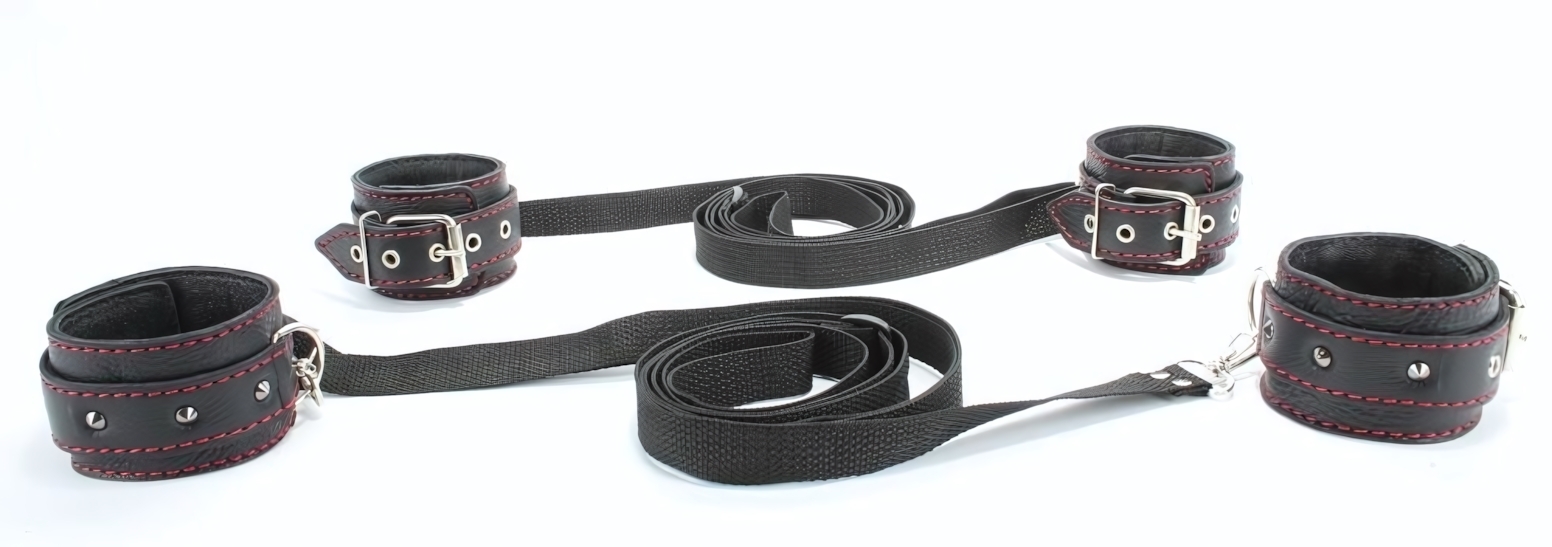 Этот стильный бондажный набор 'Black Spikes' создан для тех, кто ценит качество и комфорт в своих экспериментах. Натуральная кожа с красной контрастной строчкой не только выглядит премиально, но и обеспечивает долговечность использования.