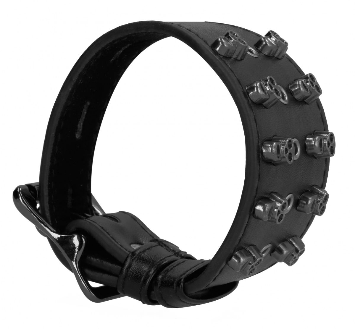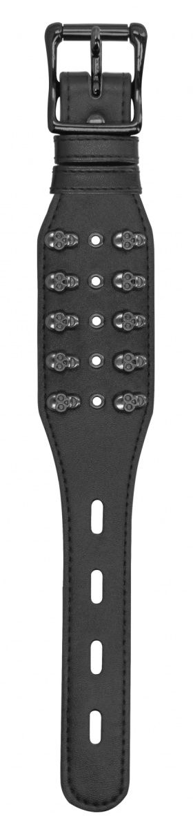 - Выразительный дизайн: Широкая манжета из черной искусственной кожи украшена тремя вертикальными рядами металлических декоративных элементов в форме черепов. Такое оформление придает аксессуару уникальный, запоминающийся вид.