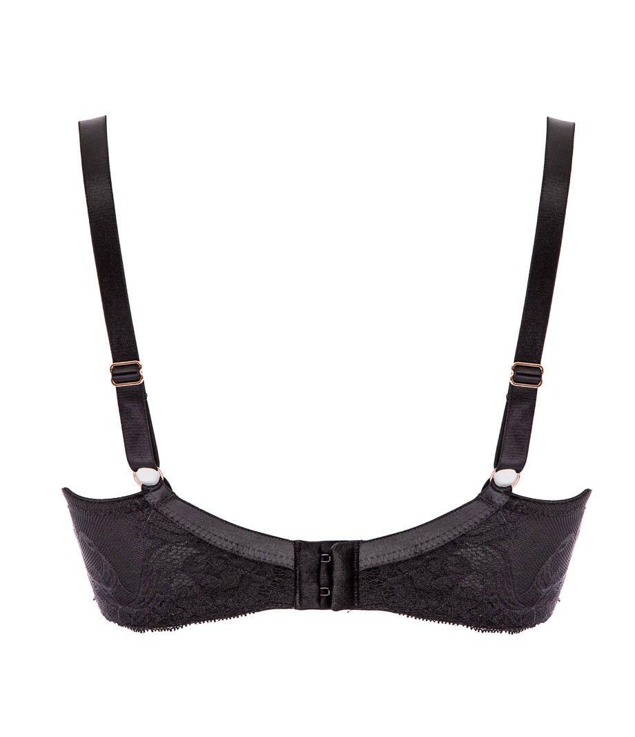 Бретели регулируются по длине, а застежка на спине оснащена металлическими крючками цвета меди, которые обеспечивают долговечность использования. Спинка из кружевного полотна с сетчатой подложкой гарантирует воздухопроницаемость и комфорт.