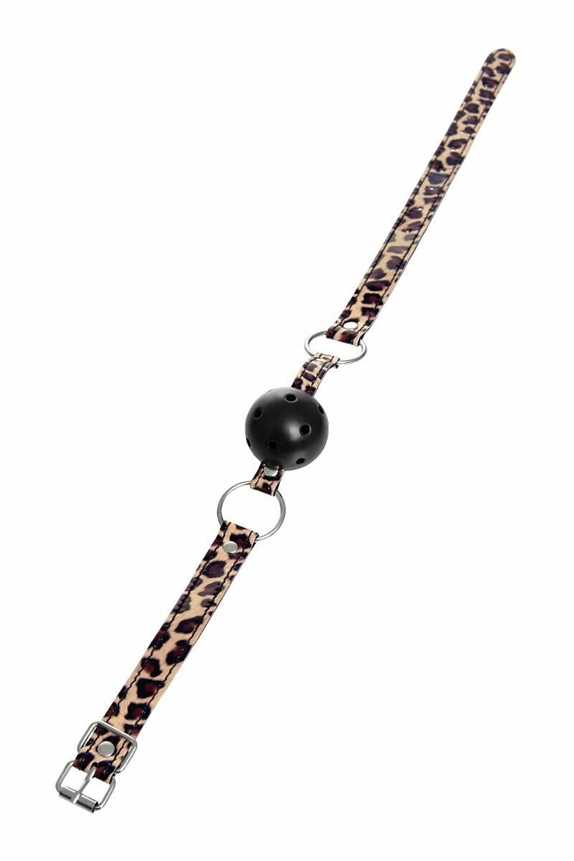 Кляп-шар с отверстиями на леопардовых ремешках, черный с леопардовым, диаметр 4.5 см, искусственная кожа