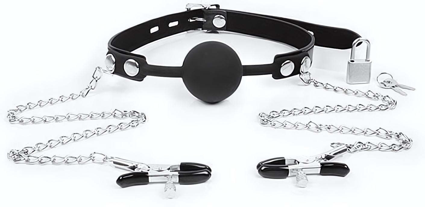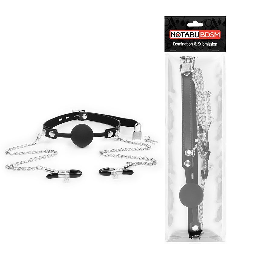 Кляп-шарик выполнен из качественного силикона, который приятно ощущается на коже. Зажимы для сосков имеют специальные эластичные накладки, предотвращающие сильное сдавливание и травмирование. Каждый зажим оснащен регулировочным винтом, позволяющим контролировать силу сжатия, что делает использование аксессуара безопасным и комфортным. Этот товар идеально подходит как для новичков, так и для опытных любителей БДСМ.