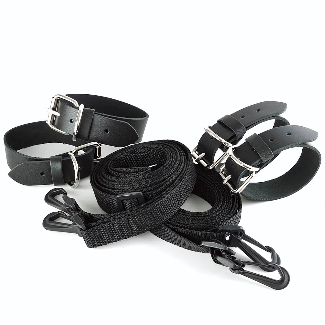 Комплект включает в себя наручники, оковы и две растяжки на кровать, которые легко крепятся с помощью прочных пластиковых карабинов. Длина каждого ремешка составляет 2,7 метра, что позволяет вам экспериментировать с различными позициями и уровнями свободы. Этот товар идеально подходит как для новичков, так и для опытных пользователей, желающих разнообразить свои интимные моменты.