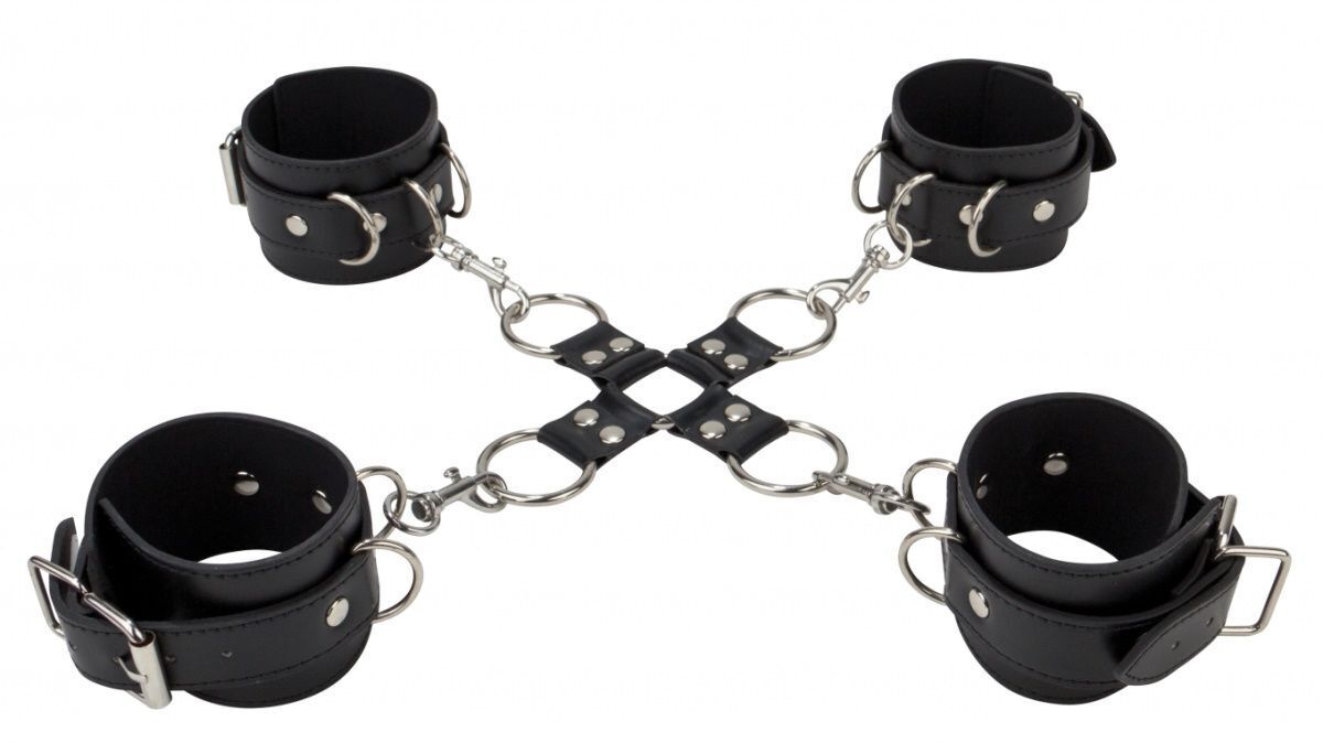 Цвет: черный. Материал: искусственная кожа. Комплект включает две пары оков для рук и ног, соединенных между собой. Это позволяет вам экспериментировать с различными позами и сценариями, не беспокоясь о безопасности. Погрузитесь в мир страсти и откройте для себя новые ощущения с комплектом оков 'Ouch!'