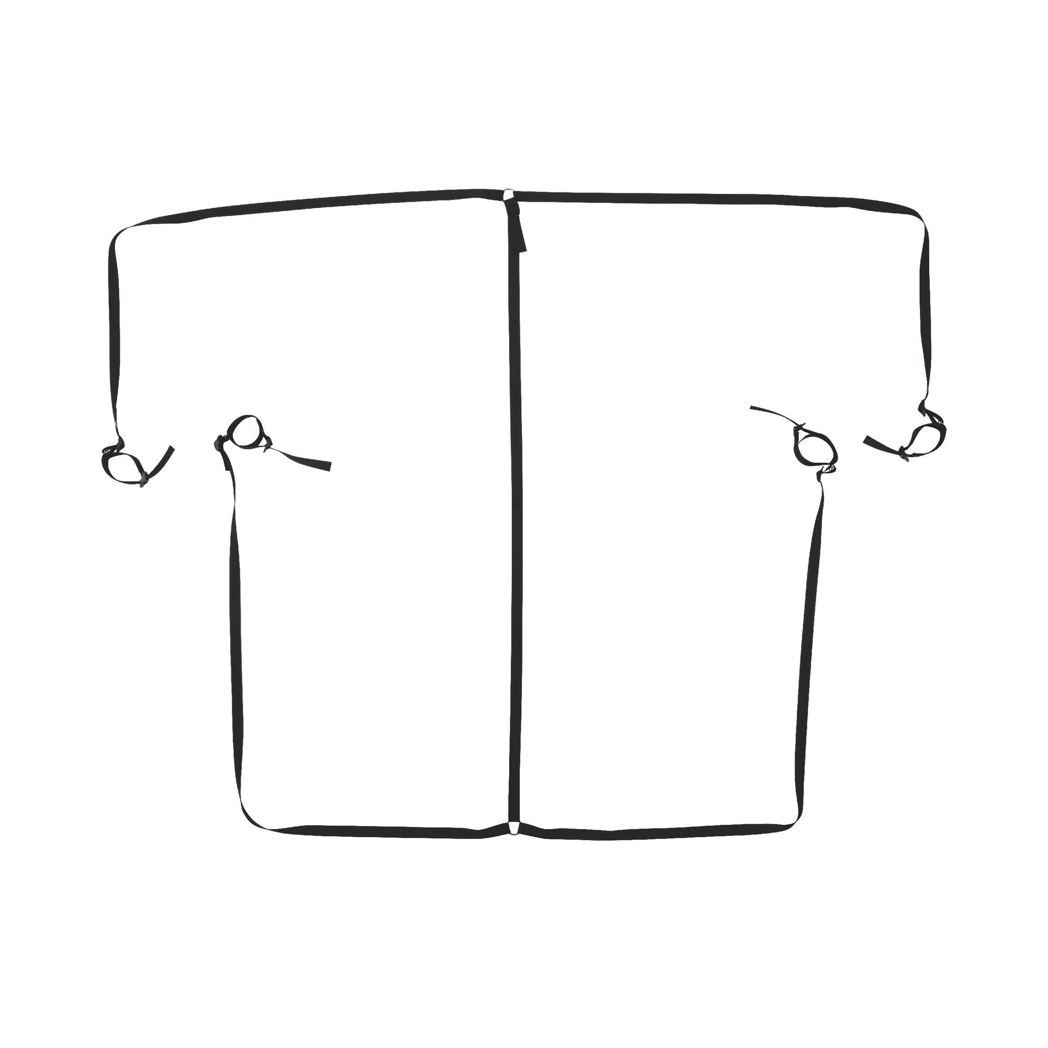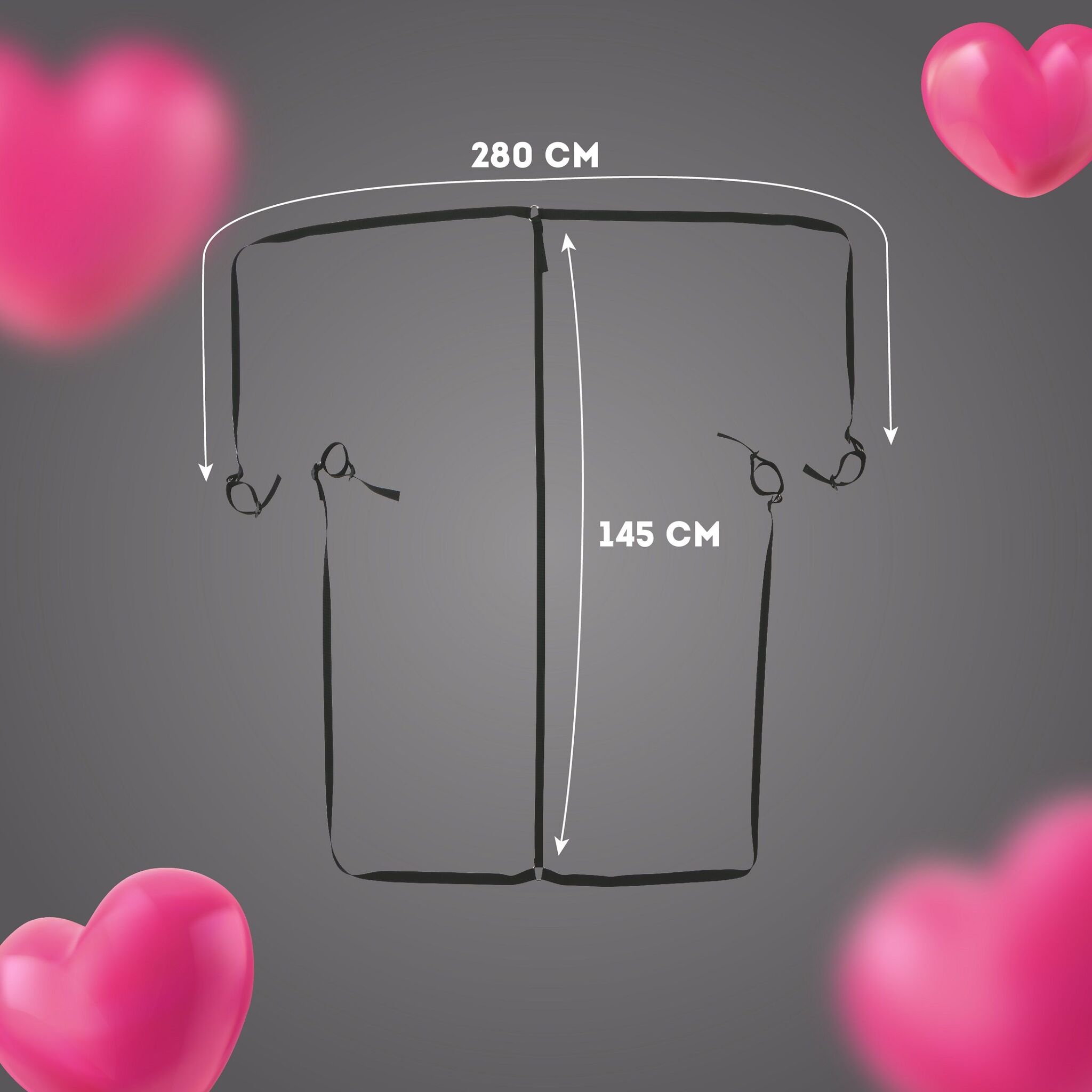 Размеры: горизонтальные ремни 280 см, вертикальные - 145 см. Материал: прочный текстиль черного цвета. Подходит для взрослых пользователей от 18 лет.