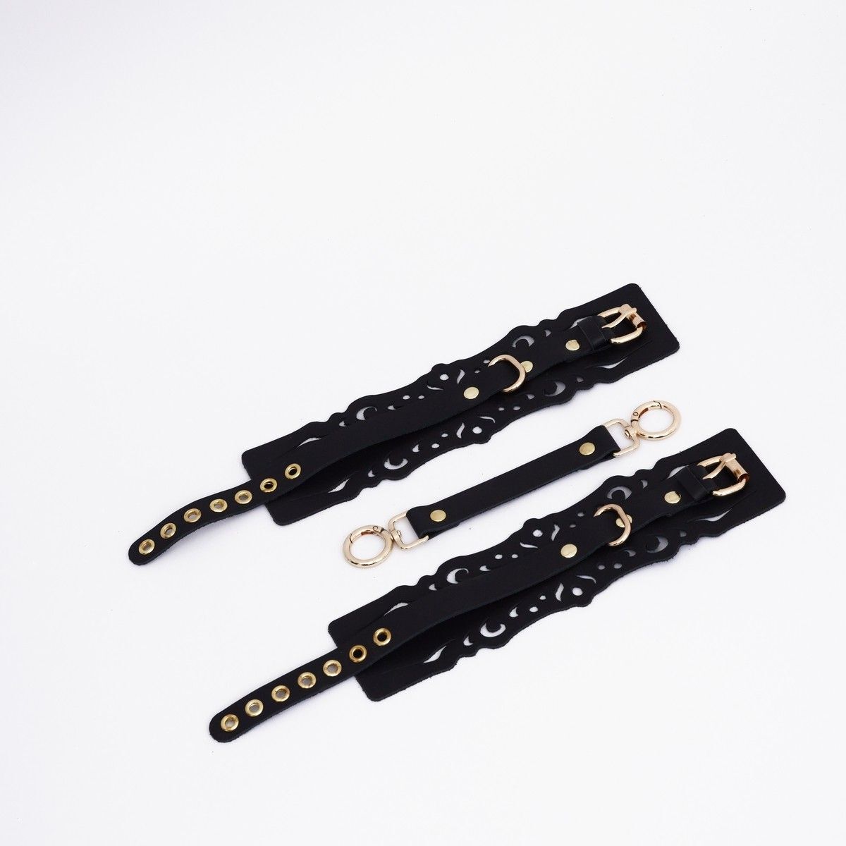 Эти кожаные оковы с узорами и золотой фурнитурой созданы для тех, кто ценит сочетание элегантности и функциональности. Они идеально подходят для использования в домашних условиях или для развлечений, добавляя атмосферу особого настроения и комфорта. Главное преимущество — возможность регулировки по объему, что обеспечивает надежную фиксацию и комфорт при использовании.