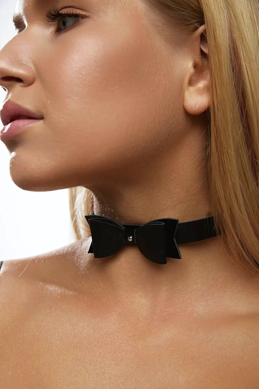 Элегантный черный кожаный чокер с бабочкой